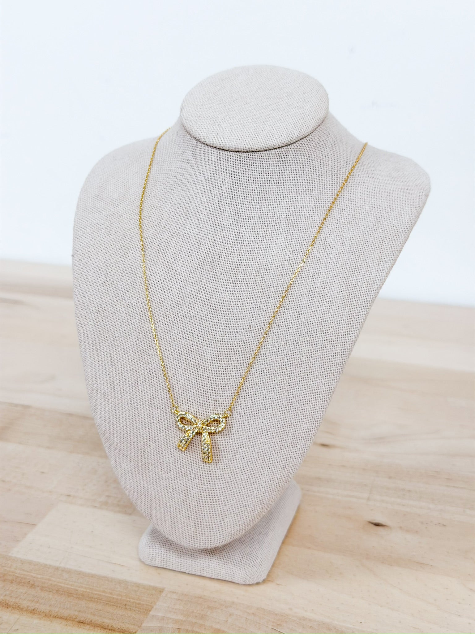 A dainty gold necklace with a cz bow for just the right amount of sparkle.