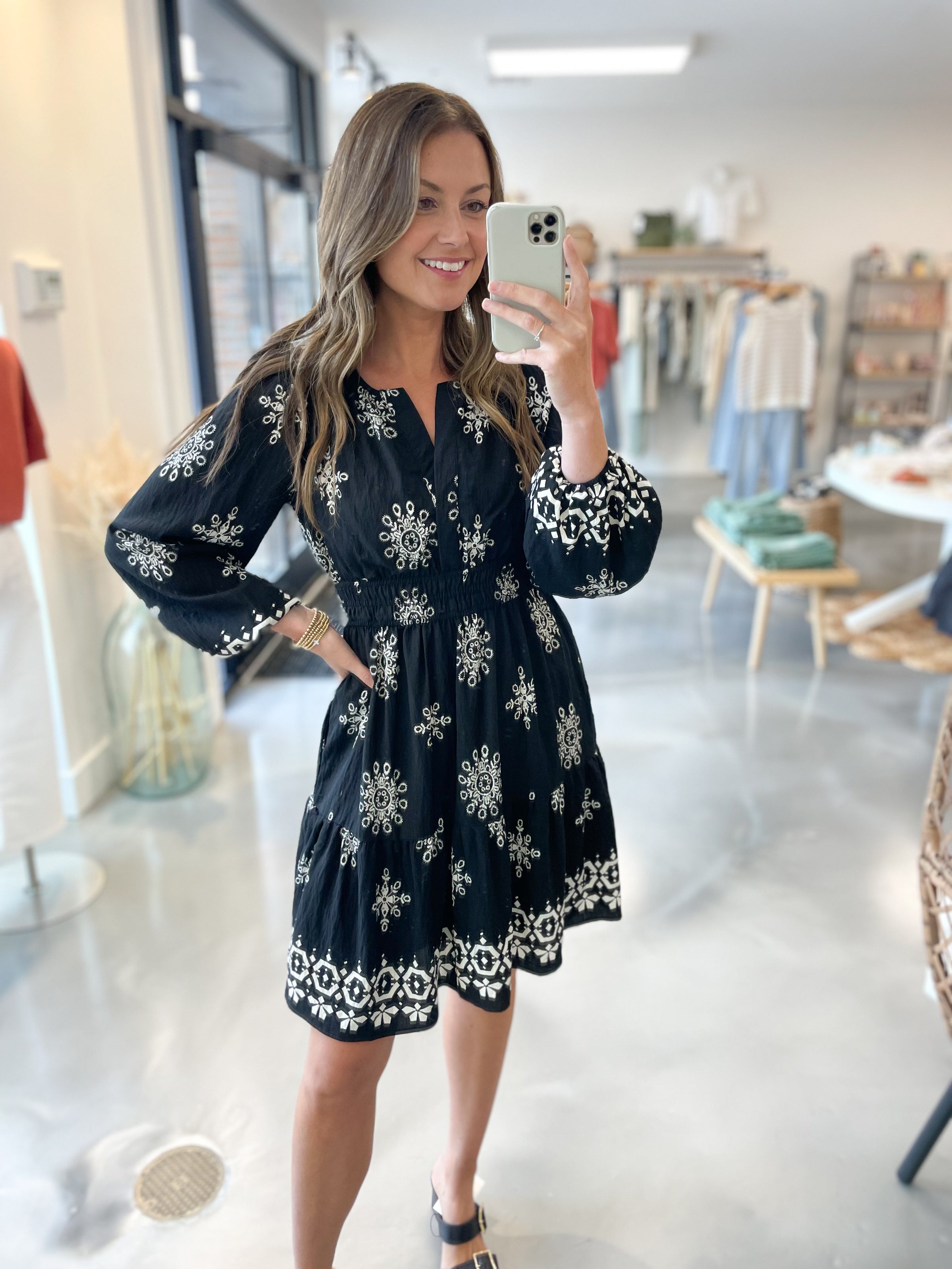 A polished floral moment, this black midi dress is made for effortless wear from season to season. It features a timeless white floral print, long puff sleeves, a notch neckline, and an elastic waist for a flattering fit. Finished with a tiered skirt for added flow, it’s the perfect dress to take you from the office to after-hours plans.