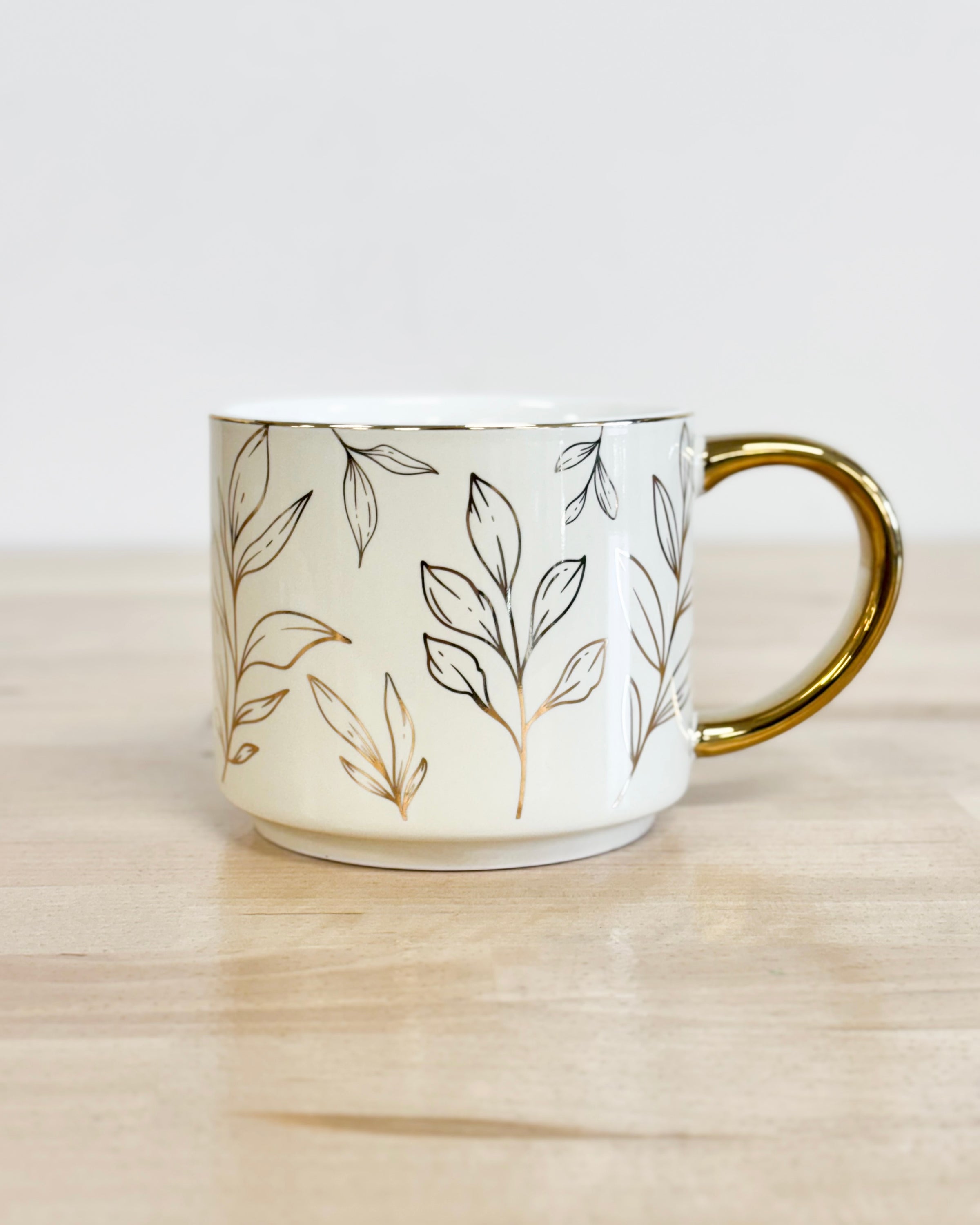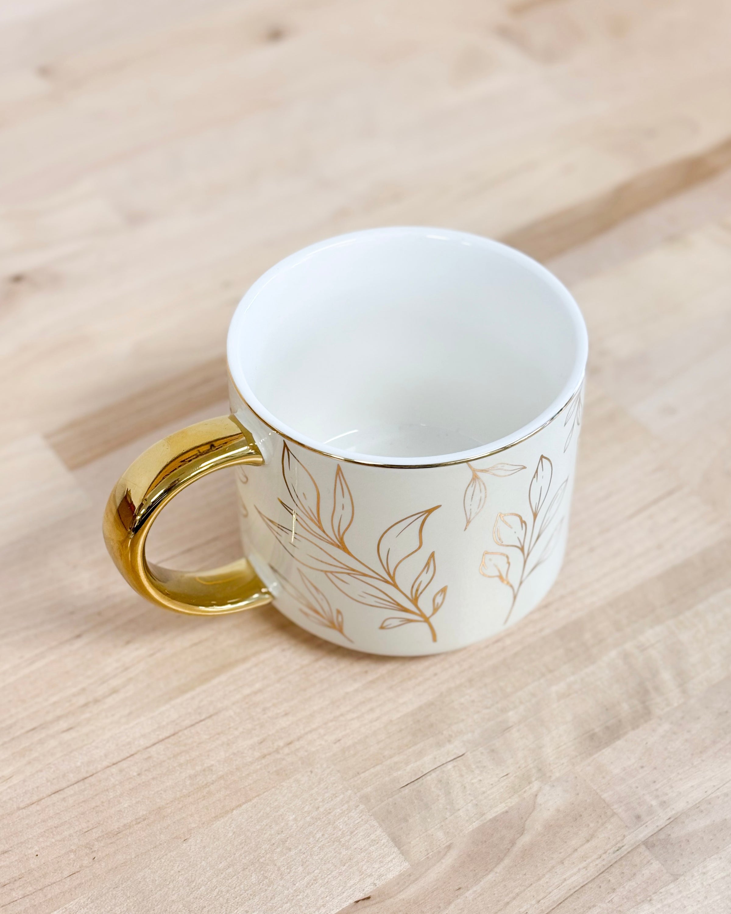 A perfectly festive mug for this cozy fall season! Features a cream color with gold handle and leaf detailing.