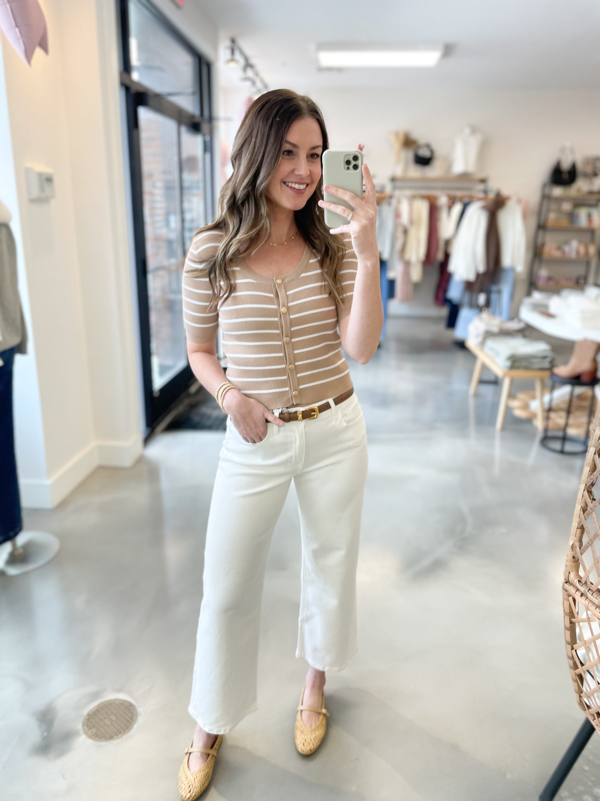 Chic, polished, and elevated. This taupe and white striped sweater features a flattering fitted silhouette in a soft, stretchy ribbed fabric that hugs in all the right places. Finished with gold snap buttons down the front for a hint of glam, it’s the perfect mix of classic and feminine. Pair it with denim for everyday or dress it up with trousers — she does both effortlessly.