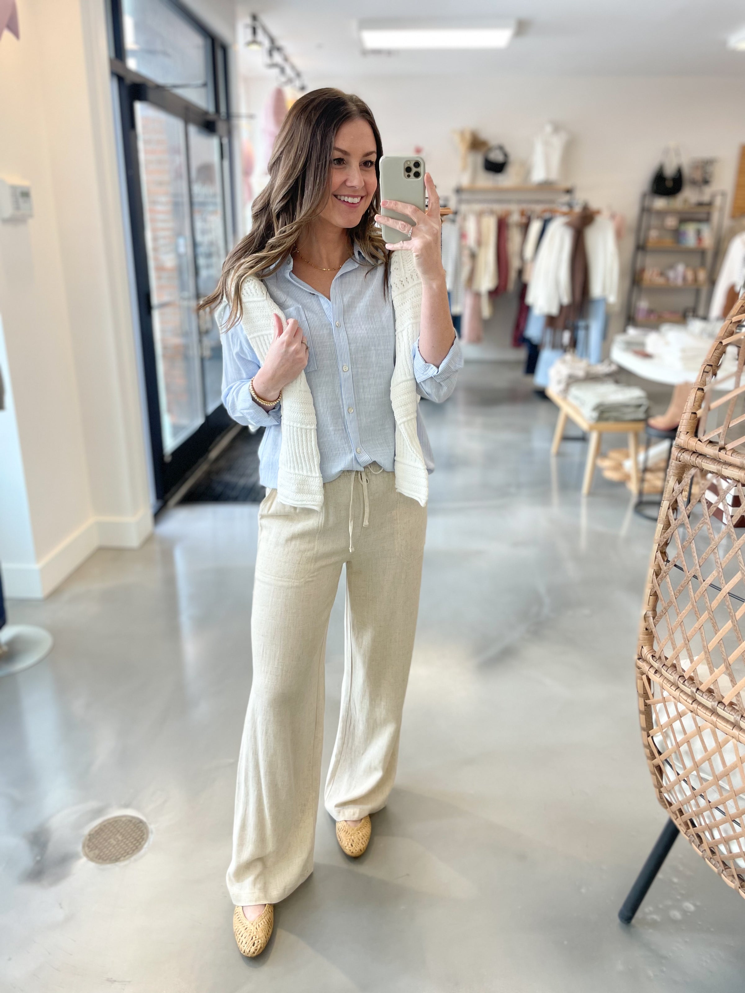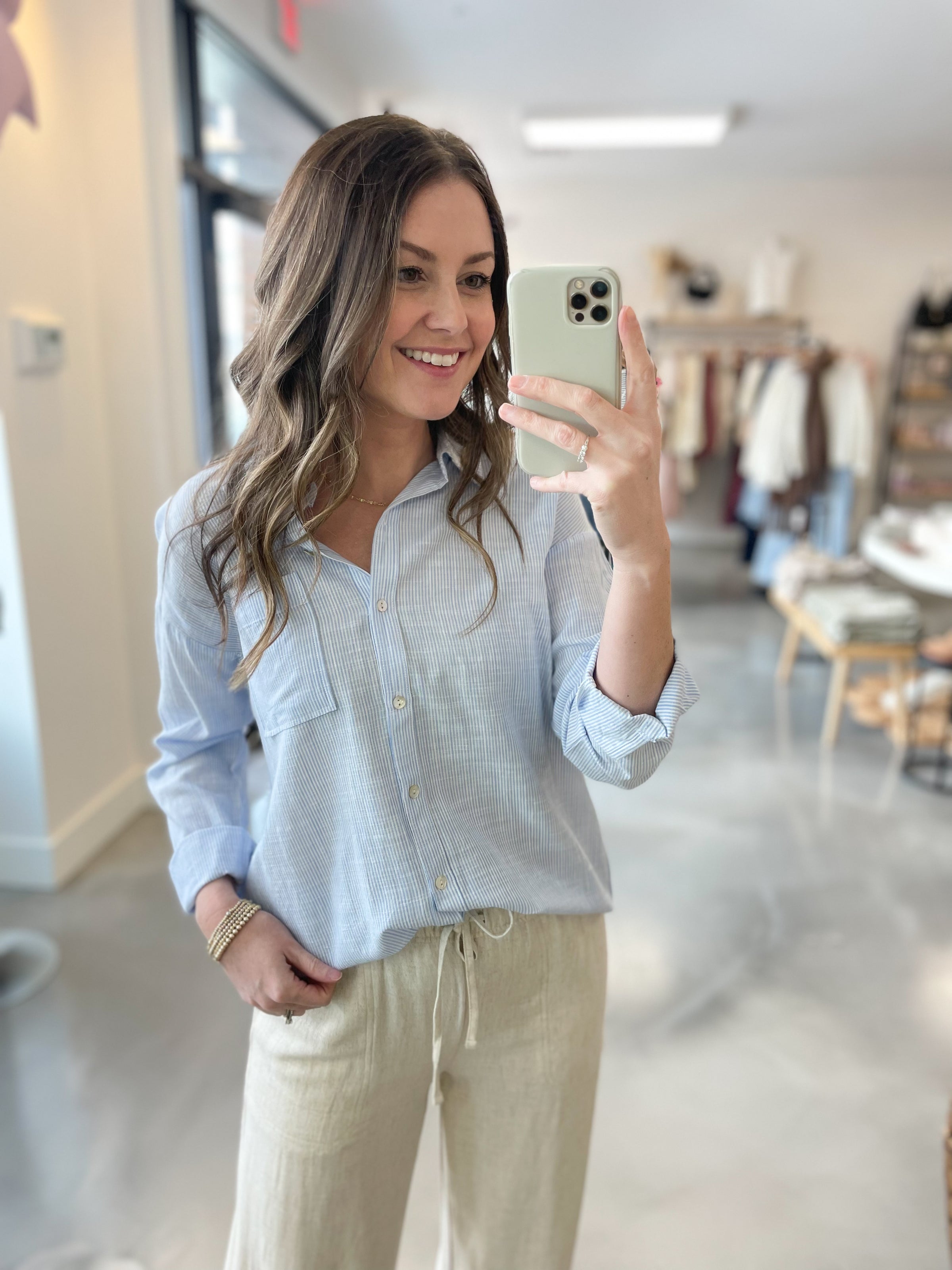 An effortless classic with a costal vibe! This chambray blue button down features subtle white pinstripes for a timeless, tailored touch. Lightweight and easy to layer, it has that perfectly relaxed feel while still looking polished. Wear it tucked, tied, or open over a tee — it’s the kind of staple that goes with everything.