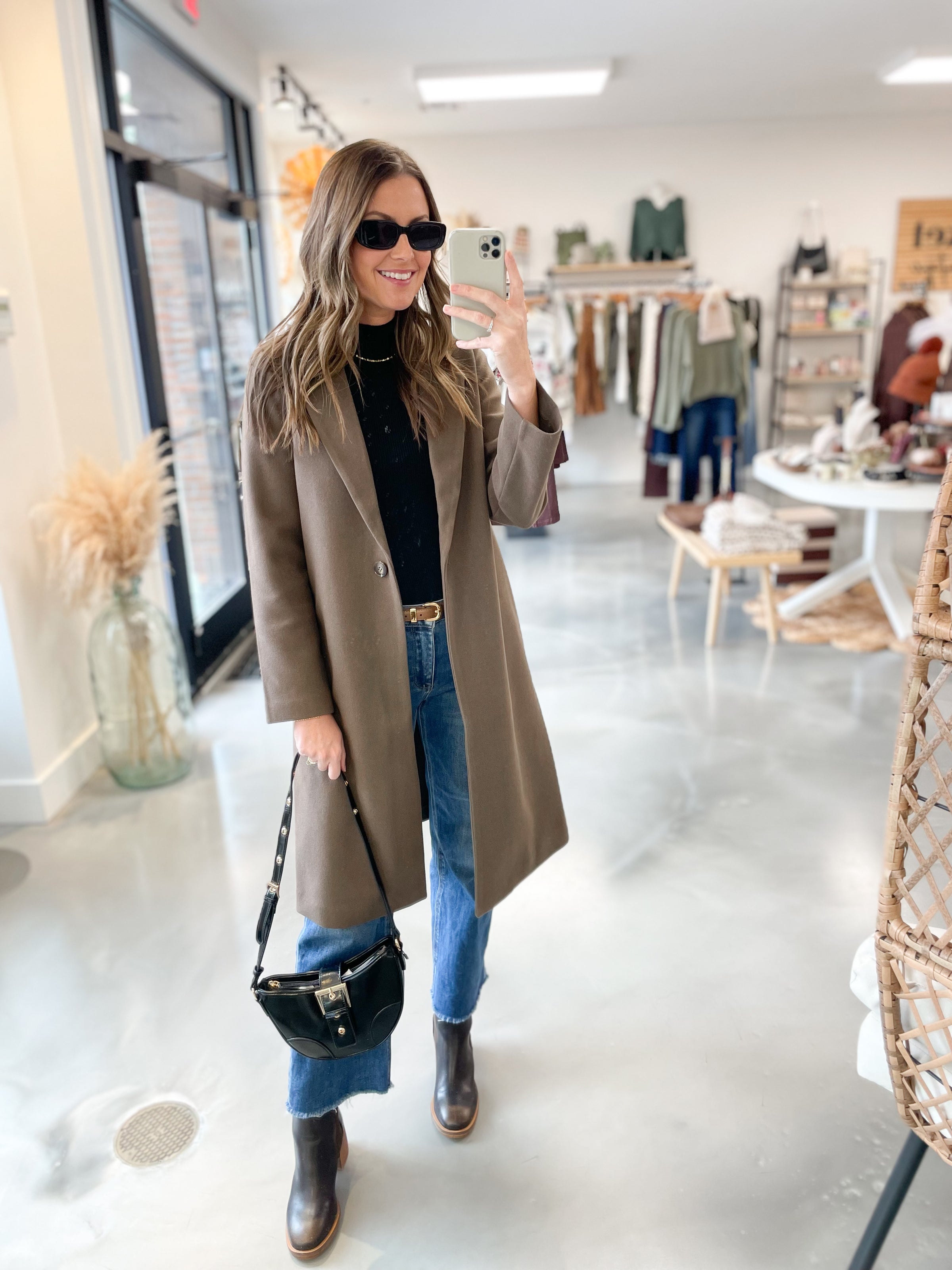 This cocoa longline coat is the definition of timeless sophistication. Designed with a tailored fit and clean lines, it features a notched collar, single-button closure, and functional pockets for a polished finish. The smooth fabric drapes beautifully, making it an easy layer over sweaters, blouses, or dresses. Perfect for elevating any outfit, this coat adds a refined touch to both casual and dressy looks.
