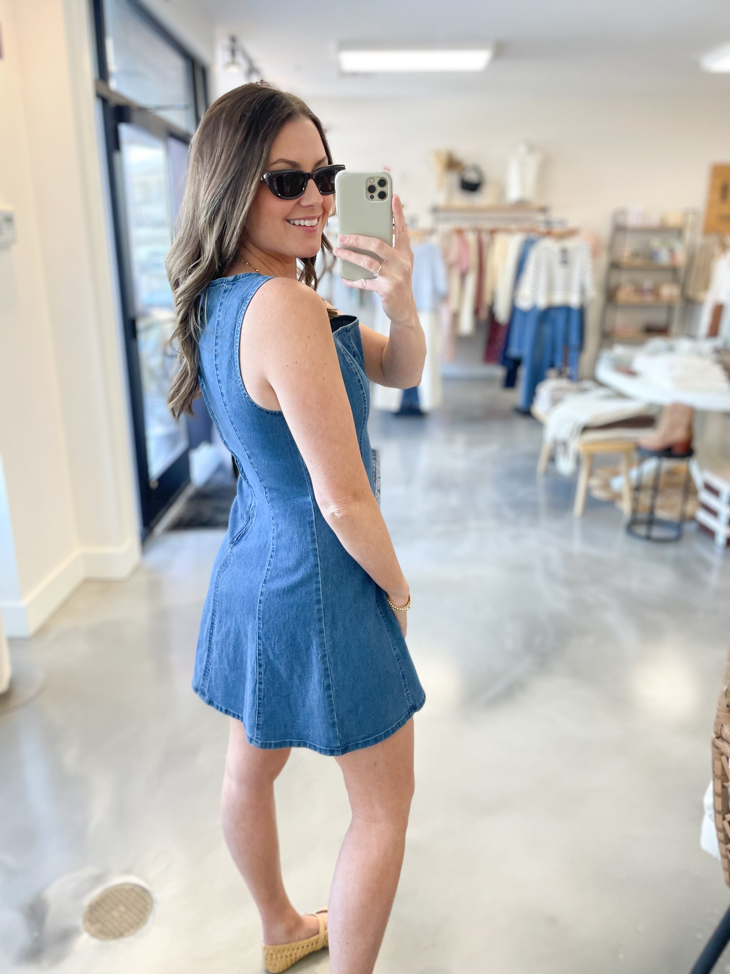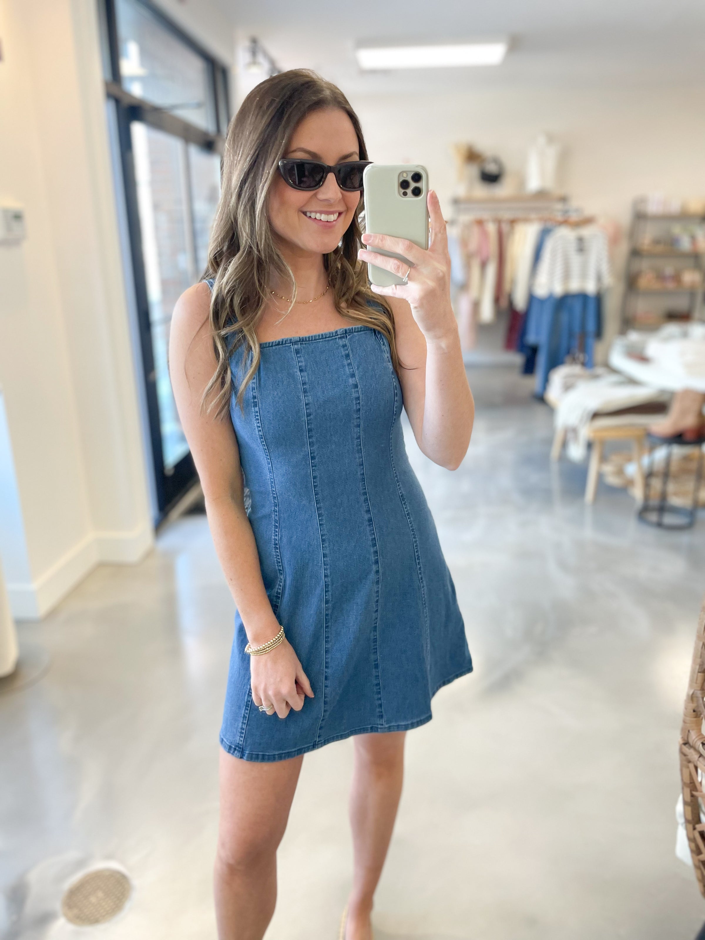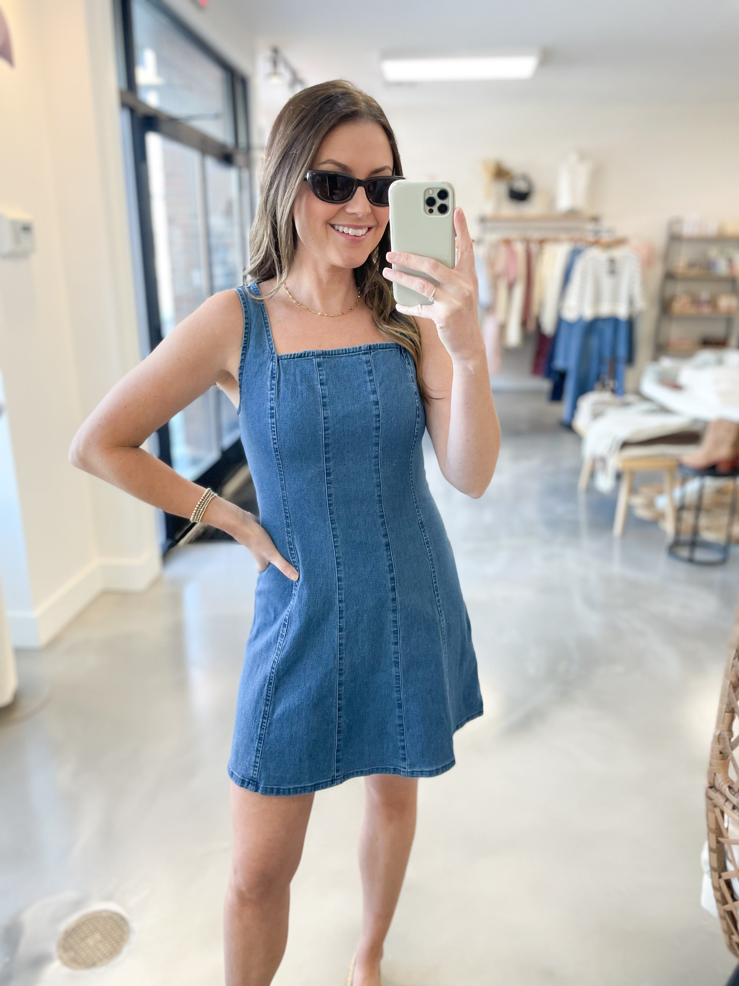 Your new go-to denim dress just arrived! This square neck denim mini dress is the perfect mix of structured and flattering. Designed in a soft, stretchy denim that hugs in all the right places, it features a chic square neckline that frames the collarbone beautifully and adds a modern, feminine touch. Vertical seam detailing elongates the silhouette for a slimming effect, while the zip-up back keeps the fit sleek and secure. The mini length makes it easy to dress up with heels or keep casual with sneakers or sandals!