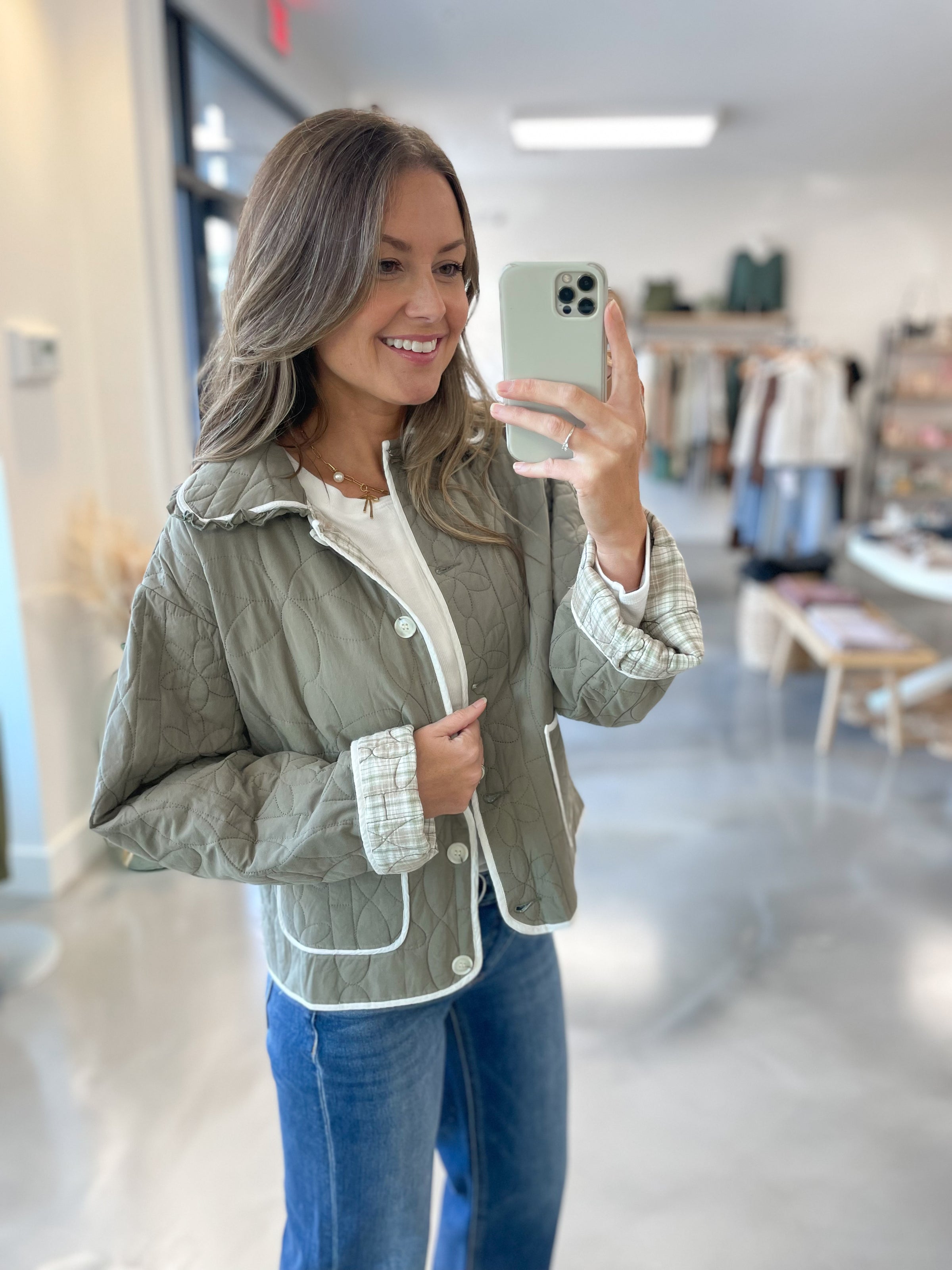 Lightweight yet cozy, this quilted jacket is the perfect throw-on-and-go layer. Designed in a soft sage green with ivory contrast piping, it features a button-front closure, roomy fit, and fold-back plaid cuffs for a subtle pop of print. The length makes it easy to pair with denim or dresses—your effortless everyday layer with a chic twist.