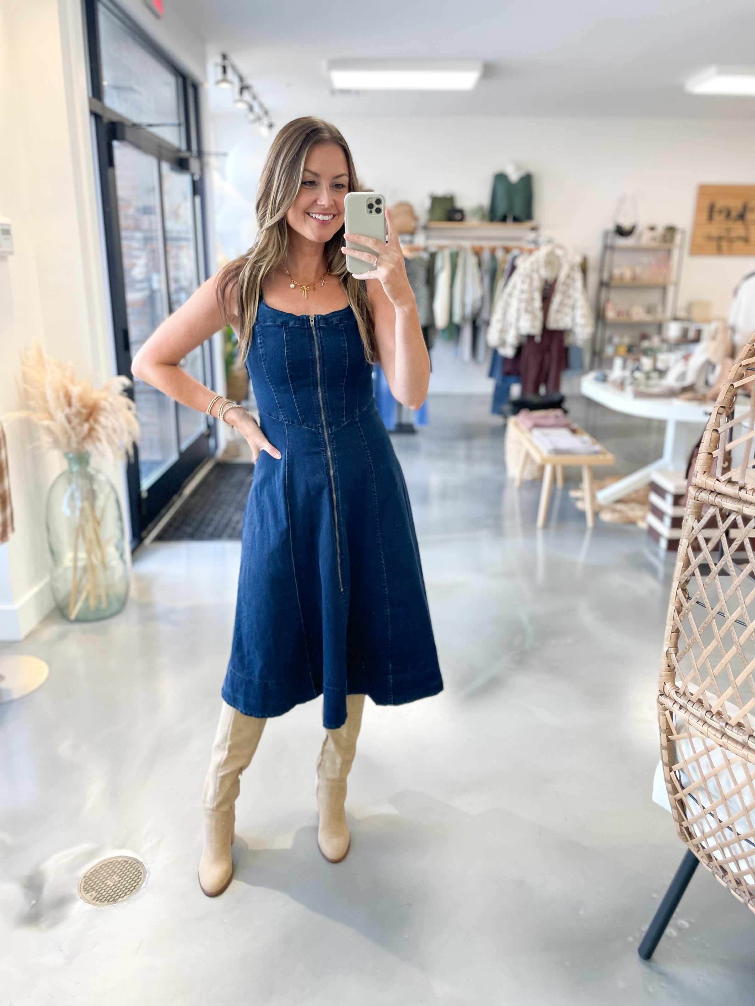 Turn heads in this effortlessly chic denim midi dress. Crafted from a structured dark wash denim, it features a corset-style bodice with seaming that flatters your shape, a front zip closure for an edgy touch, and adjustable straps for a customizable fit. The midi length keeps it versatile—perfect for pairing with sneakers for daytime ease or heels for a night out.