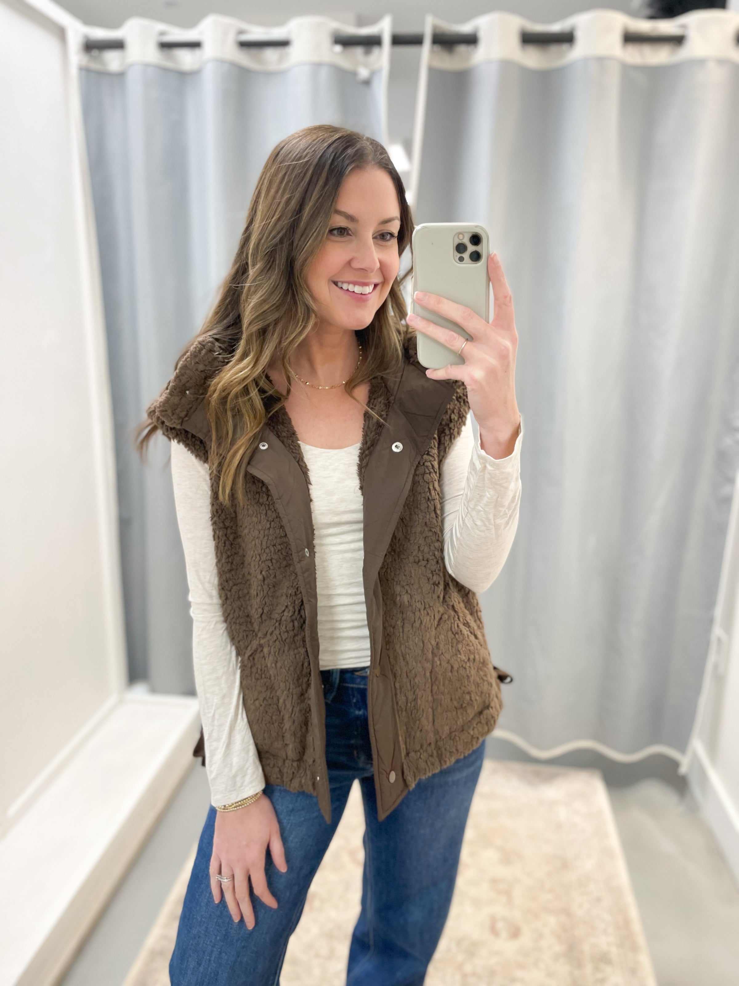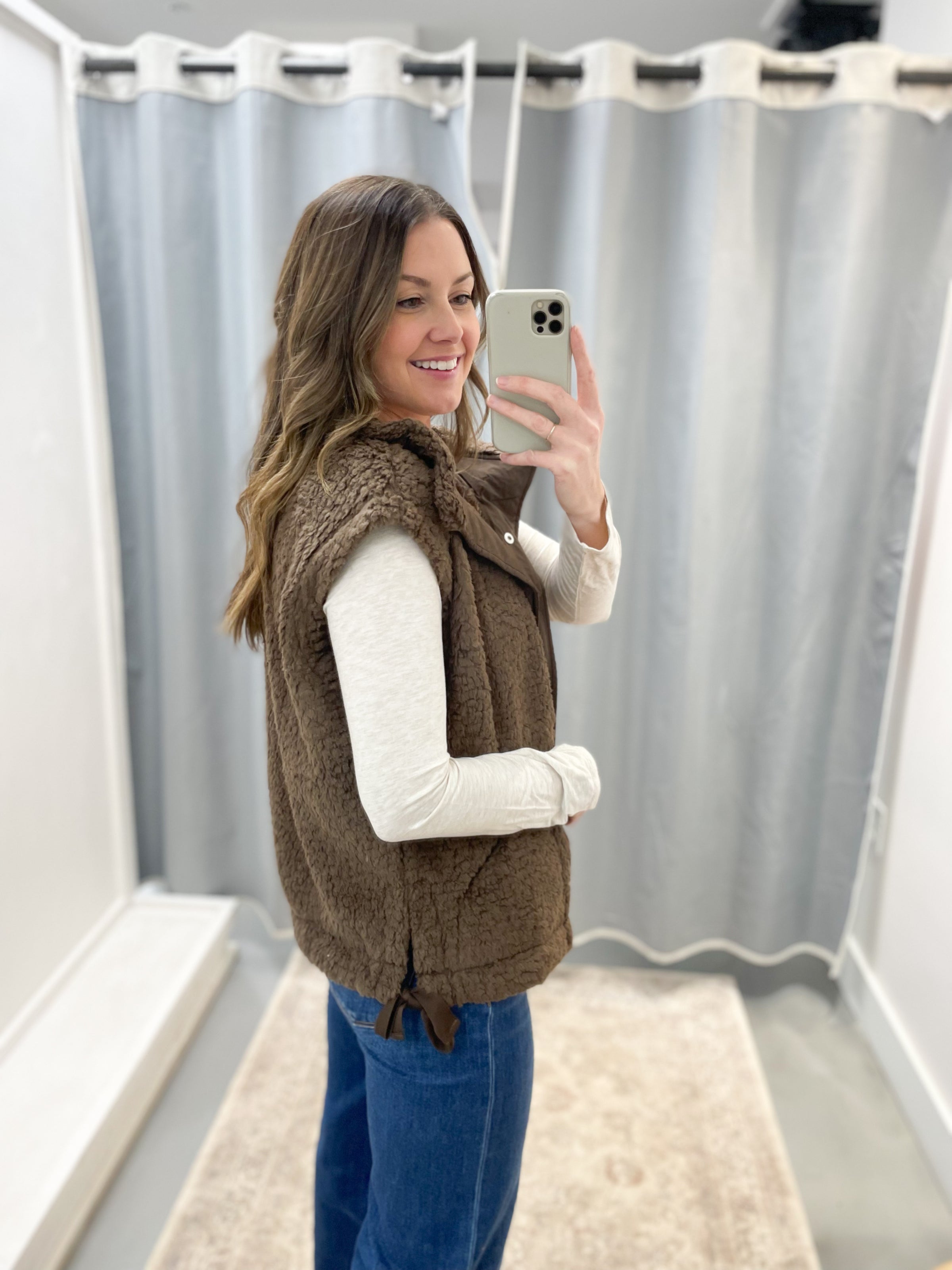 Cozy meets cool in this oversized sherpa vest — the ultimate layering piece for fall and winter. Designed with a plush, ultra-soft texture that feels like a warm hug, this vest adds instant comfort and laid-back style to any outfit. The relaxed, oversized fit makes it easy to layer over sweaters, flannels, or long sleeves, while the snap front keeps it functional and chic. Perfect for chilly mornings, coffee runs, or weekend errands — it’s that effortless, throw-on-and-go piece you’ll reach for all season long.