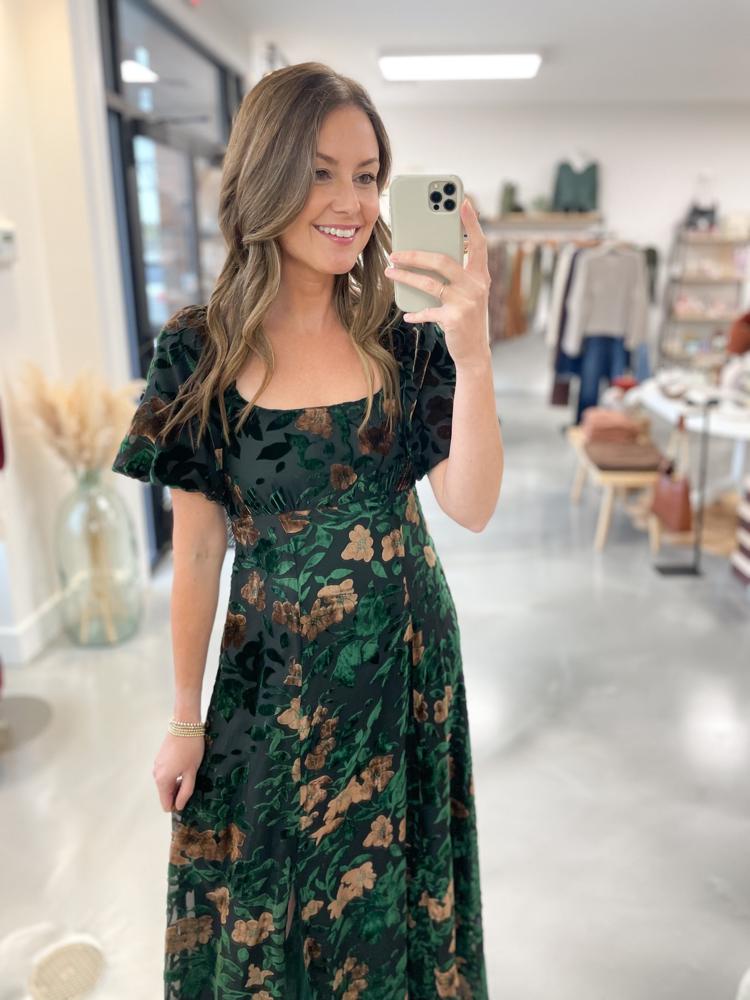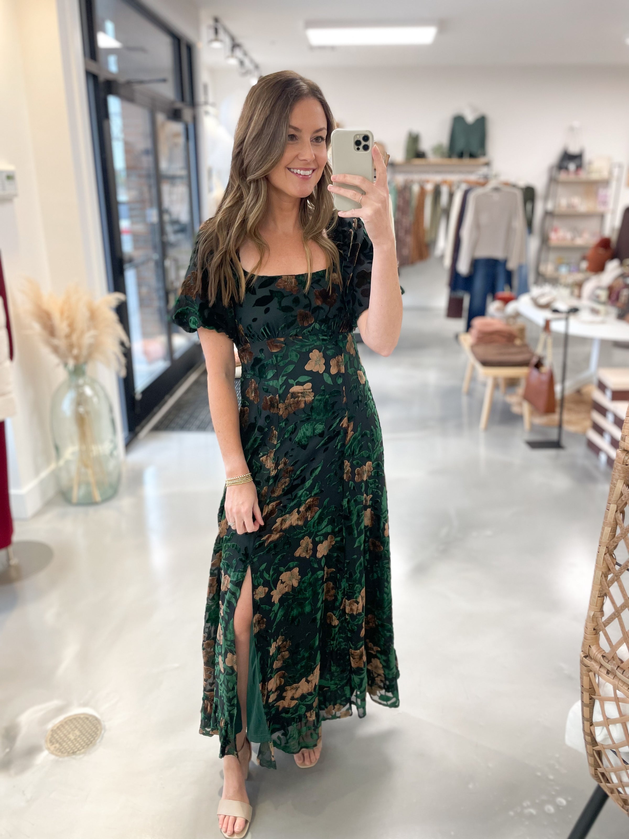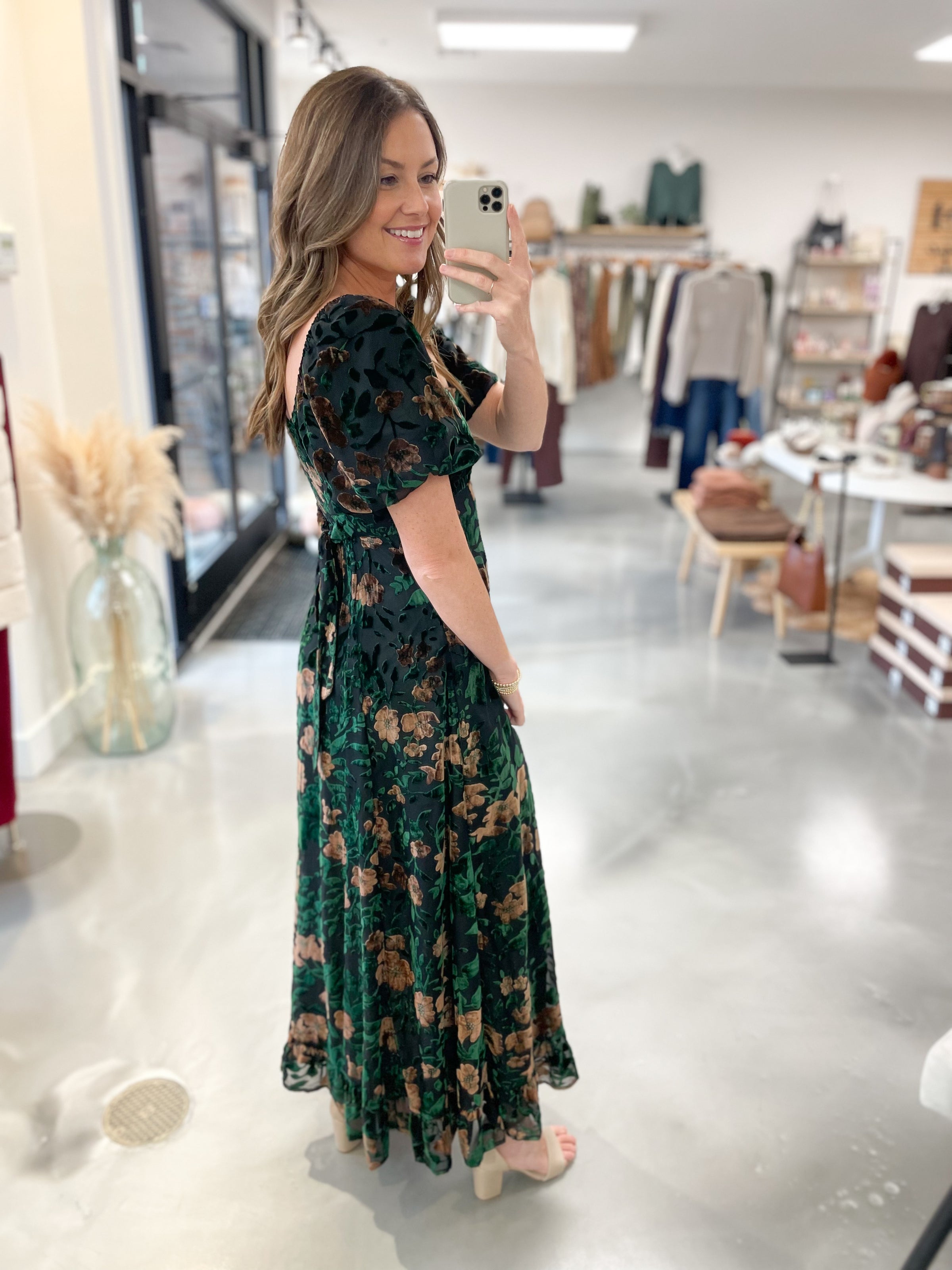 This floral velvet burnout dress is the perfect mix of romantic and elevated. Featuring a soft overlay with velvety floral detailing, it catches the light beautifully with every movement. The feminine silhouette flatters effortlessly, while the luxurious texture adds depth and dimension. Whether you’re dressing it up for a special occasion or styling it with boots for a night out, this dress is sure to turn heads with its dreamy, vintage-inspired charm.