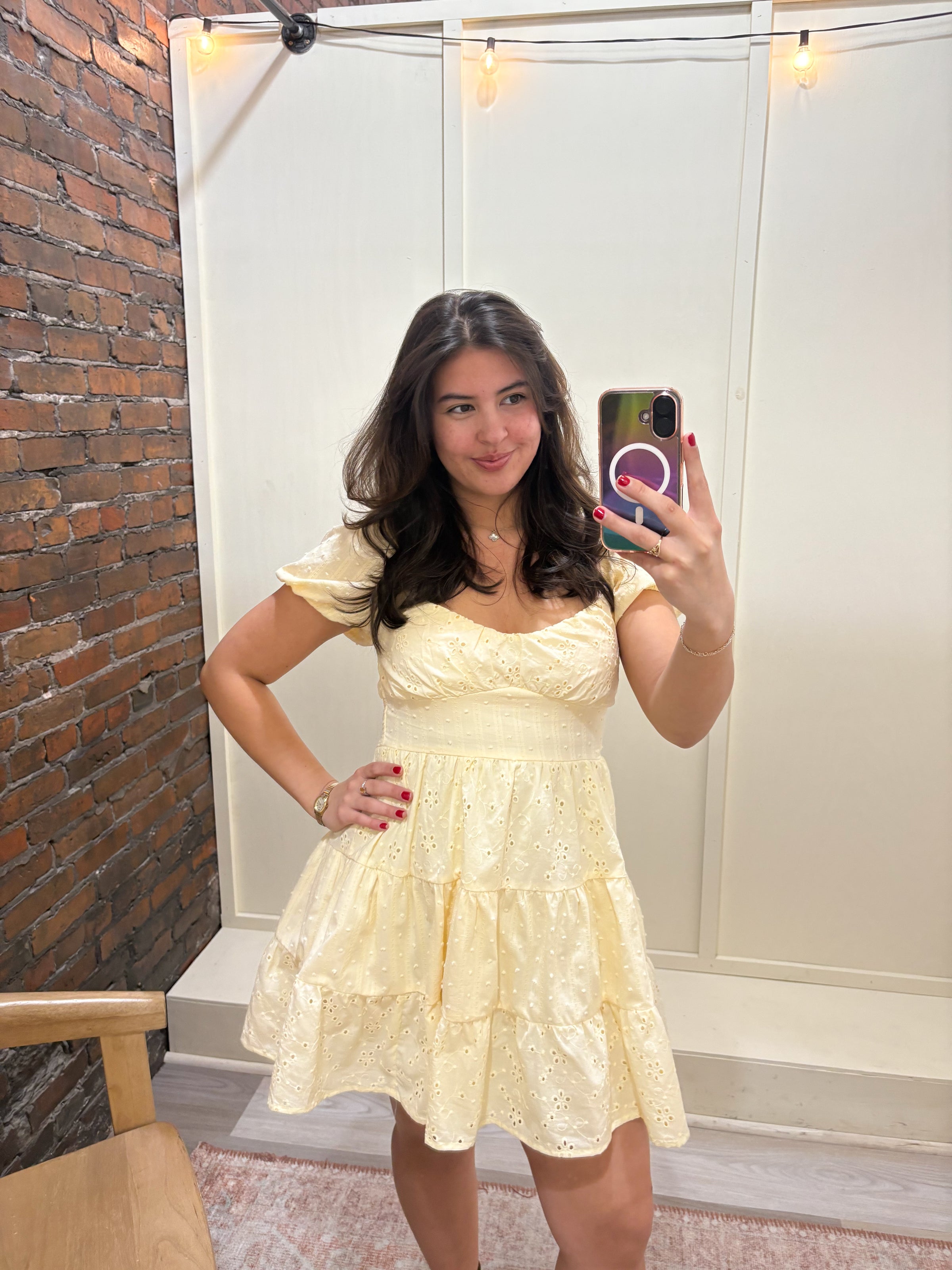 Sweet, feminine, and made for sunshine—this butter eyelet mini dress is the definition of effortless charm. Featuring a flattering fitted bodice with delicate eyelet detailing, it’s paired with a soft square neckline and puff sleeves for a romantic touch. The tiered skirt adds the perfect amount of movement and flow, while the lightweight fabric keeps it breezy and comfortable. Whether you’re heading to brunch, a shower, graduation, or a summer getaway, this is the kind of dress you’ll reach for again and again.
