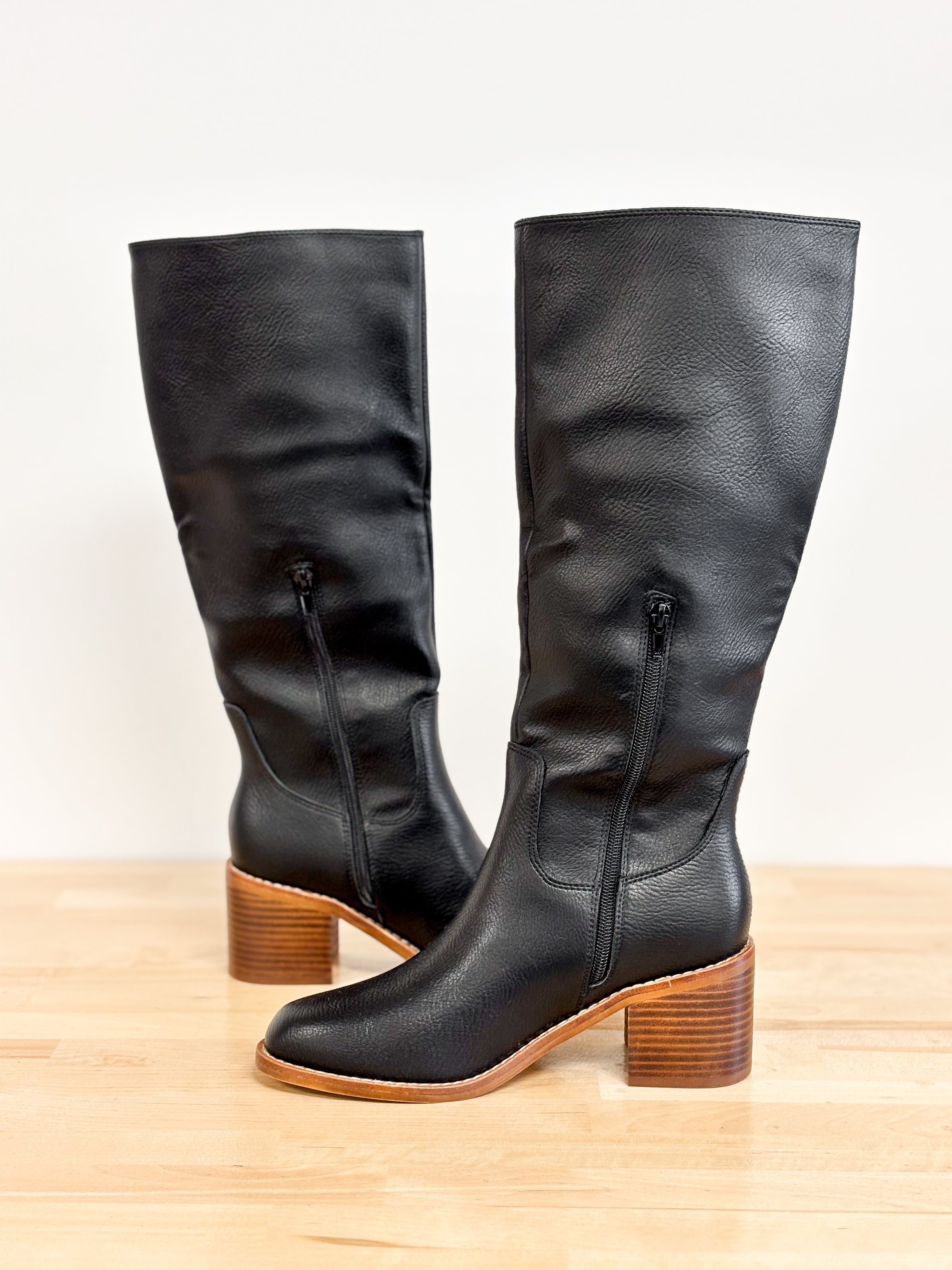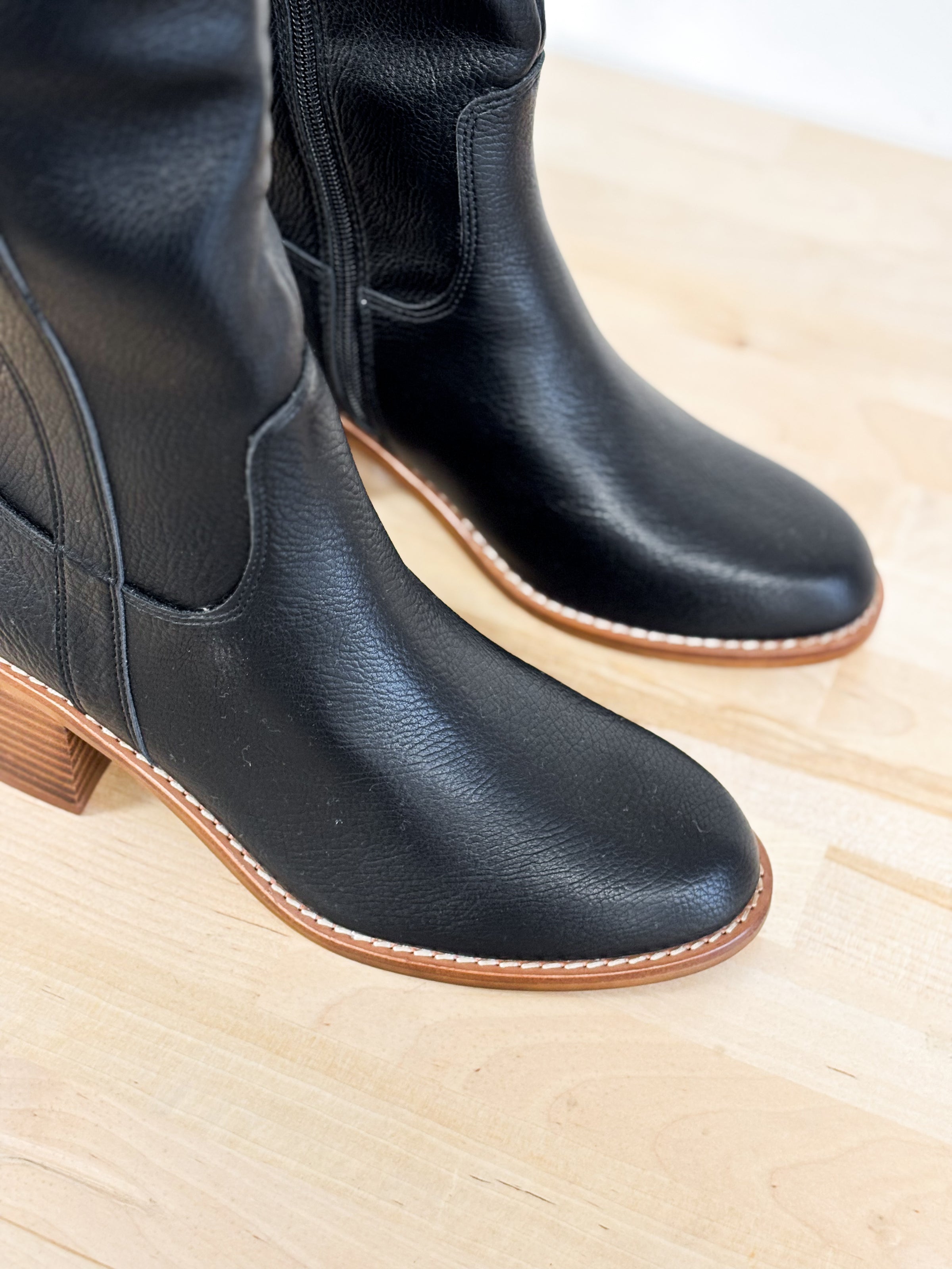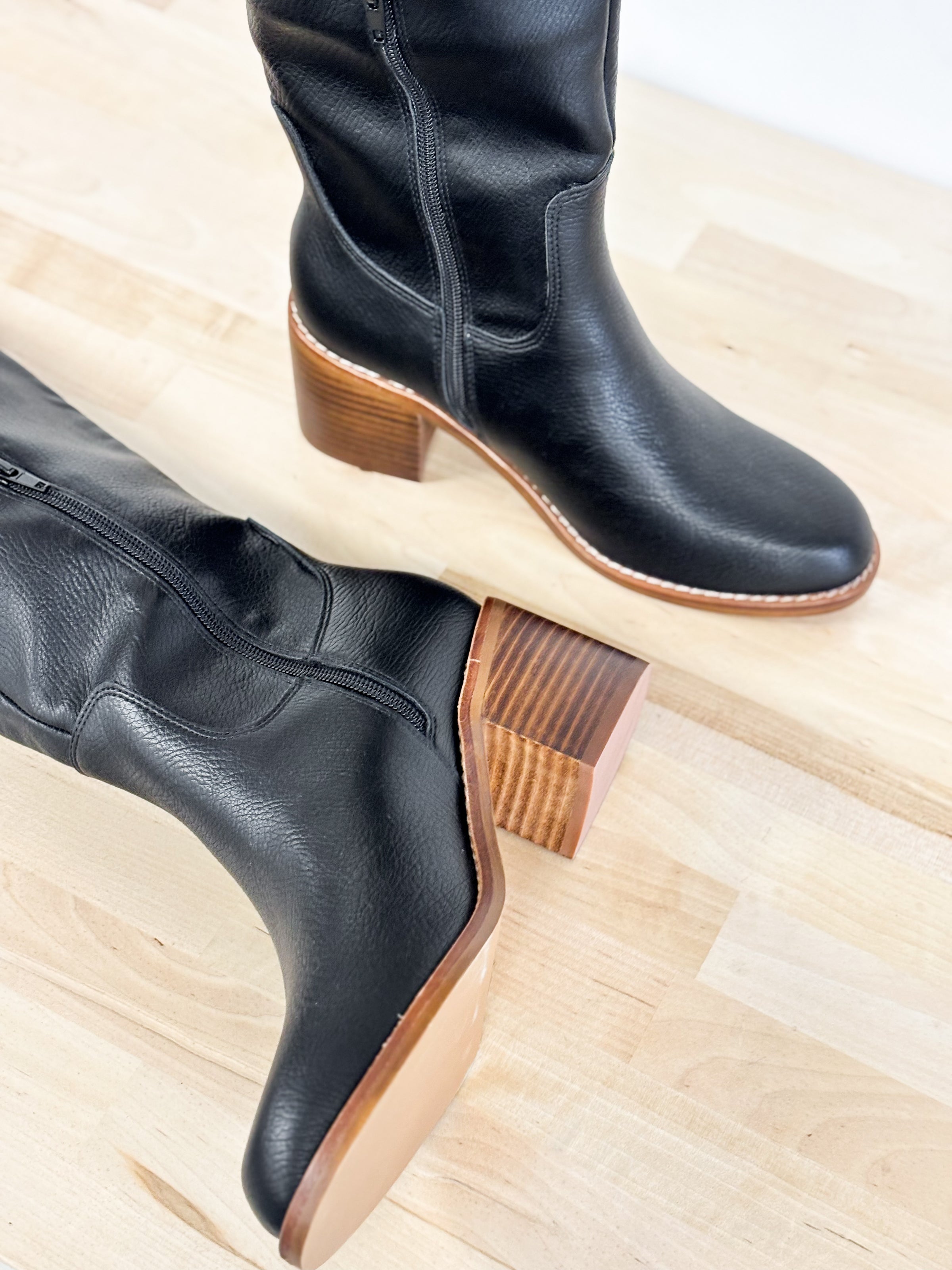A timeless boot you’ll reach for season after season. Crafted in a soft faux leather finish, this just-under-the-knee style features an almond toe, stacked block heel, and an easy inner side zipper for a sleek fit. Equal parts chic and versatile, these boots bring effortless sophistication to any look — whether styled with your favorite mini dress and sweater or paired with denim for a classic everyday vibe.