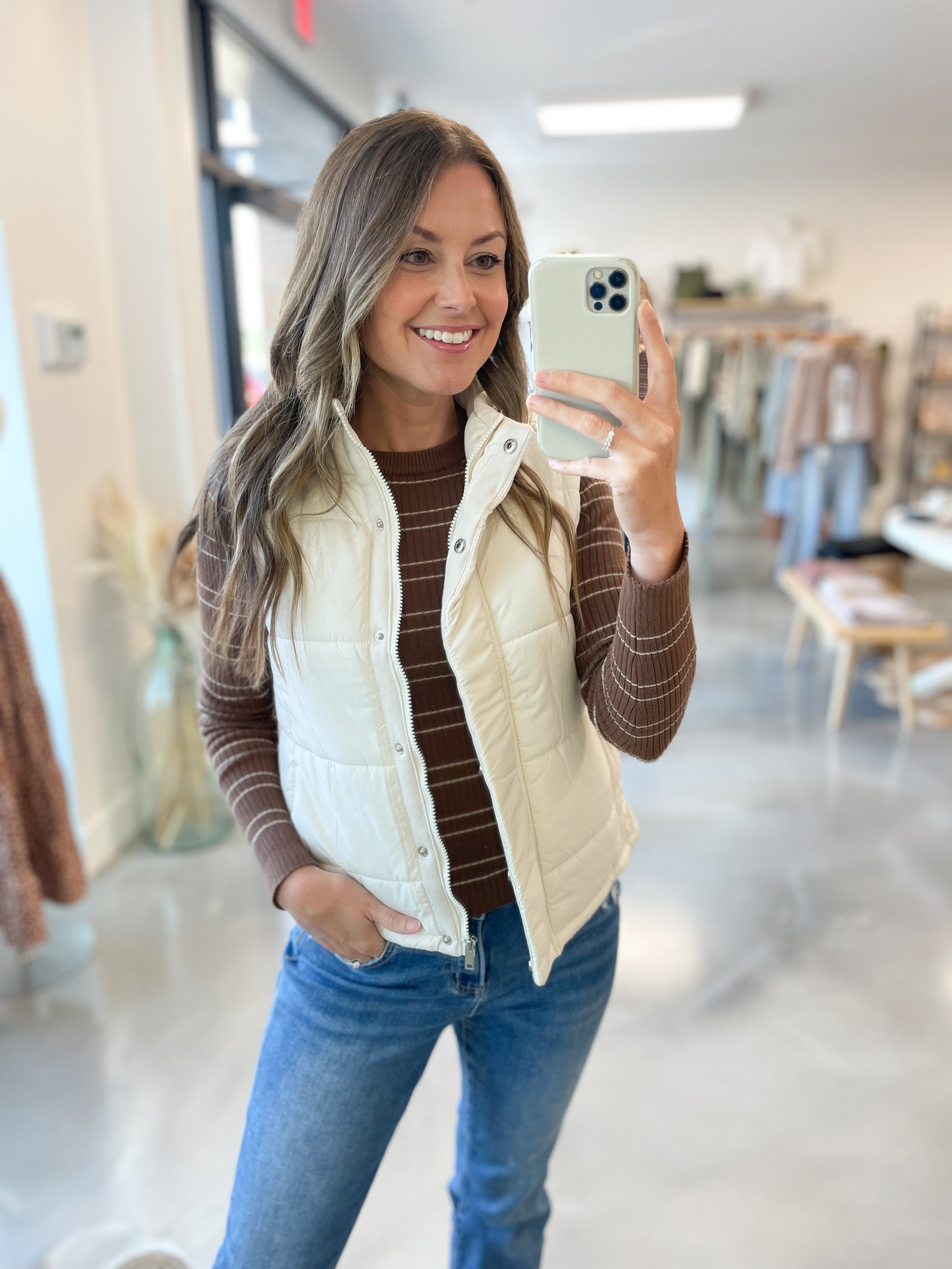 A chic layer for cooler days, this ivory puffer vest blends style and function effortlessly. Designed with a lightweight quilted body, it adds the perfect amount of warmth without feeling bulky. The neutral ivory hue makes it endlessly versatile—pair it with cozy knits, flannels, or long-sleeve basics for an easy elevated look. Finished with sleek front pockets and a zip-up closure, it’s the go-to piece for layering all season long.