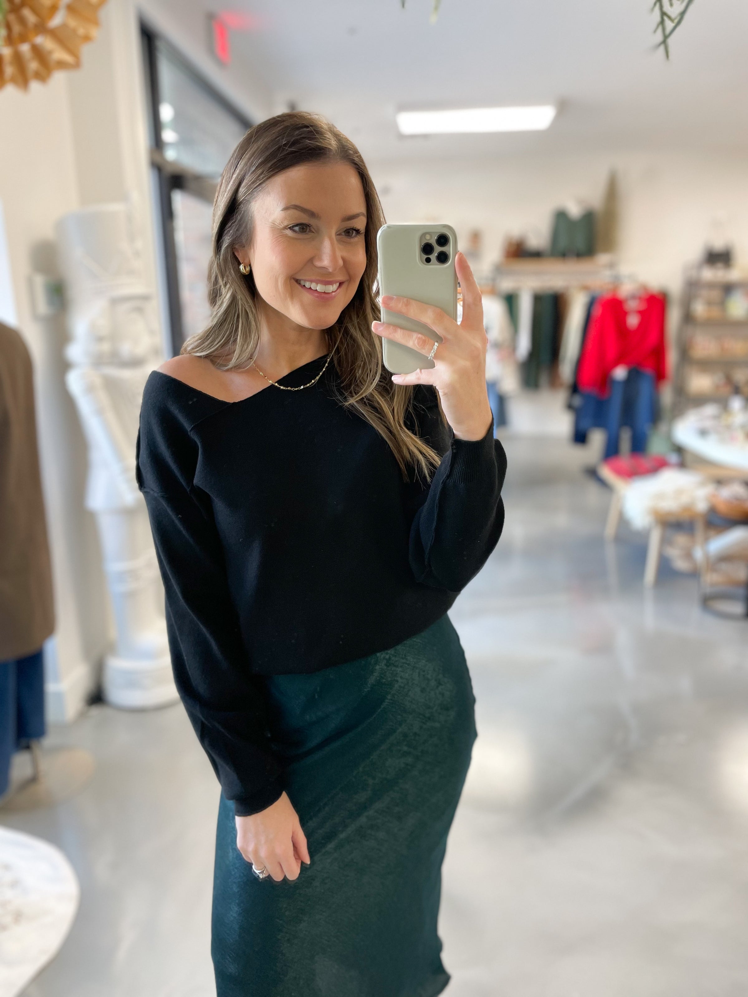 Effortlessly chic and endlessly versatile, this black off-shoulder sweater is the perfect blend of cozy and elevated. Made from a soft, medium-weight knit, it features a relaxed silhouette that drapes beautifully while giving you that subtle, flirty neckline detail. The slouchy off-shoulder fit adds a touch of elegance, making it easy to style for both casual days and dressed-up nights. Pair it with denim for an easy everyday look or with a satin skirt for a refined, holiday-ready outfit. A timeless staple you’ll reach for again and again.
