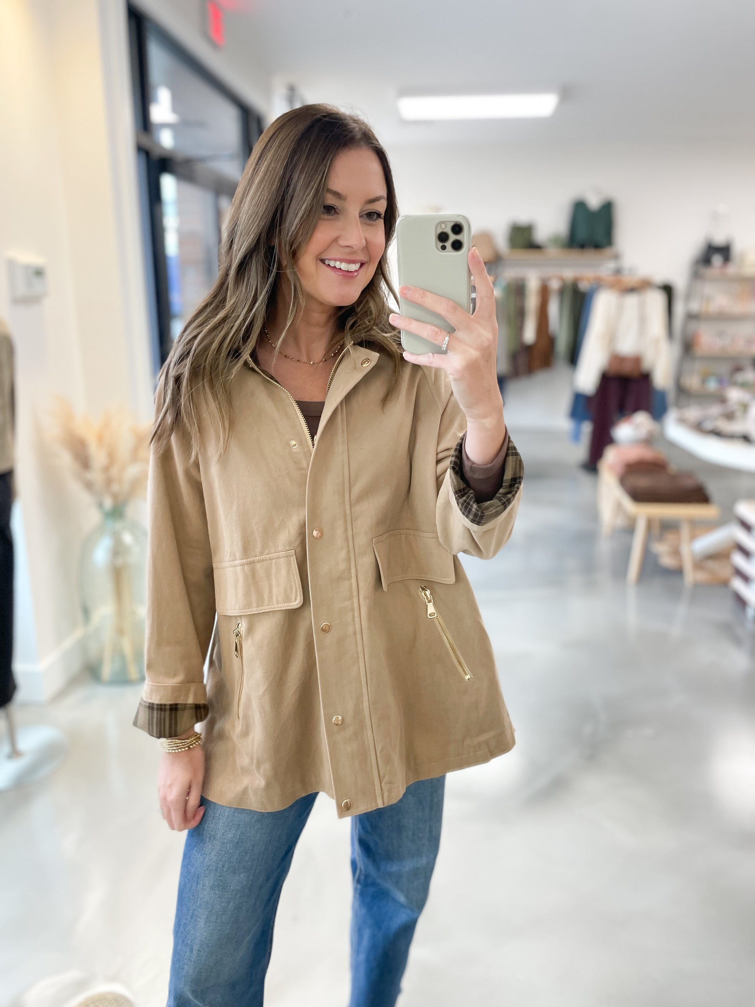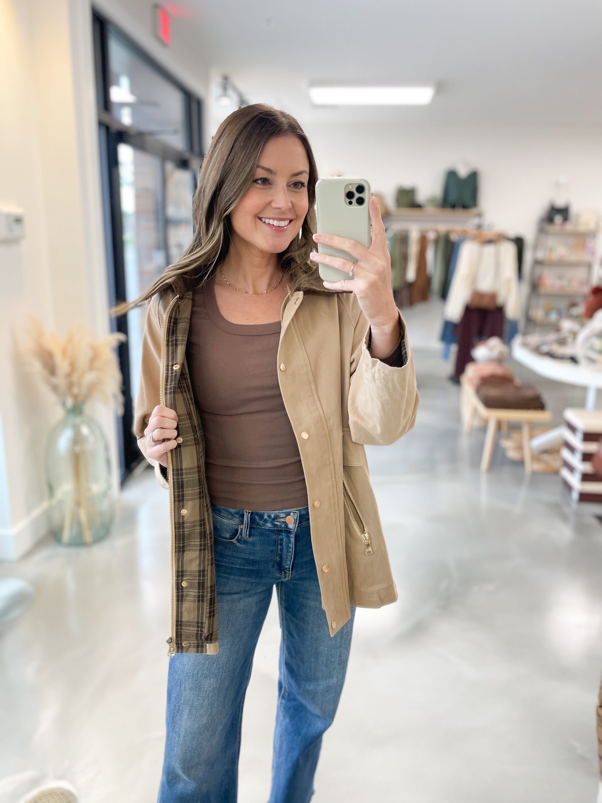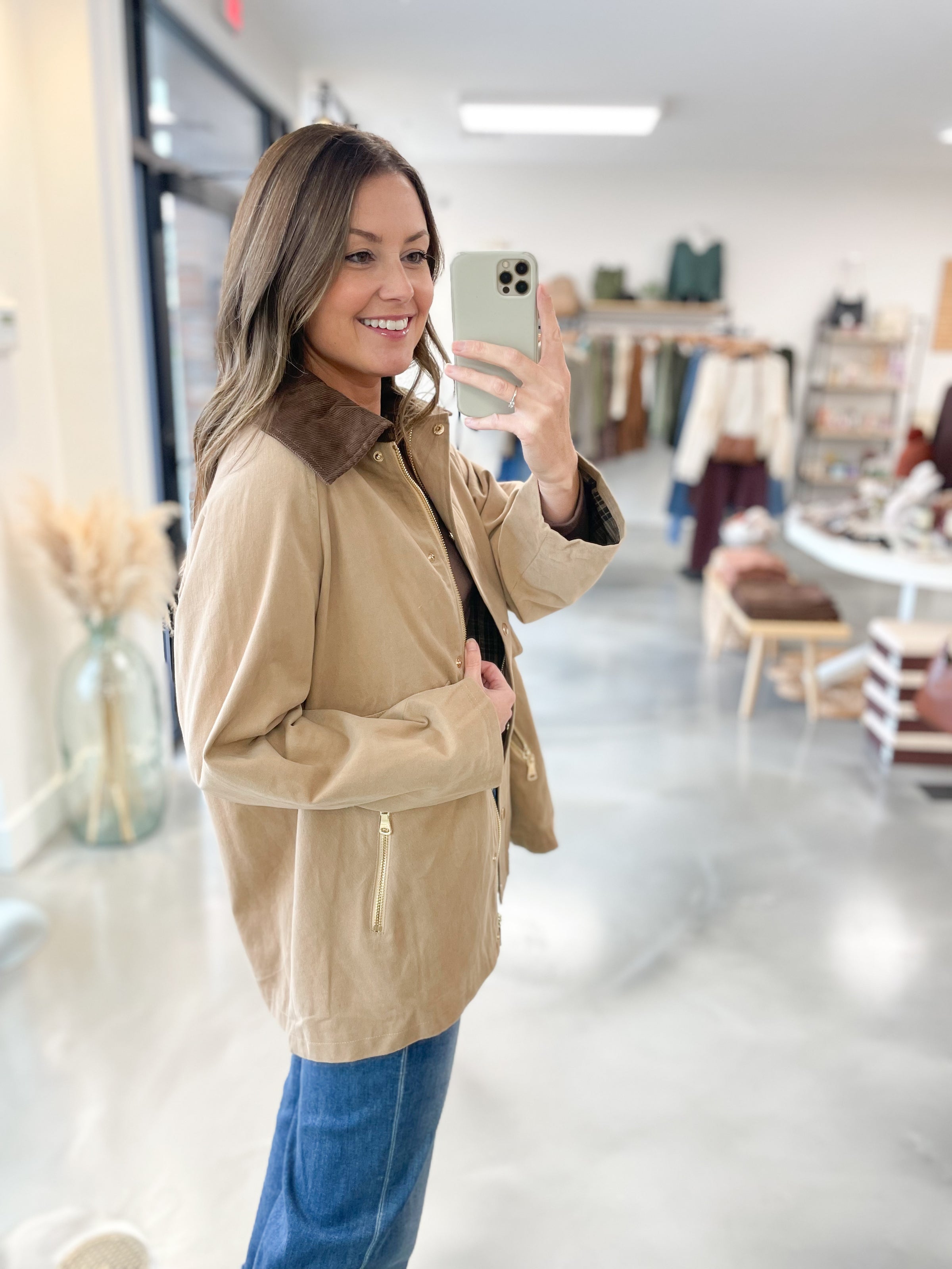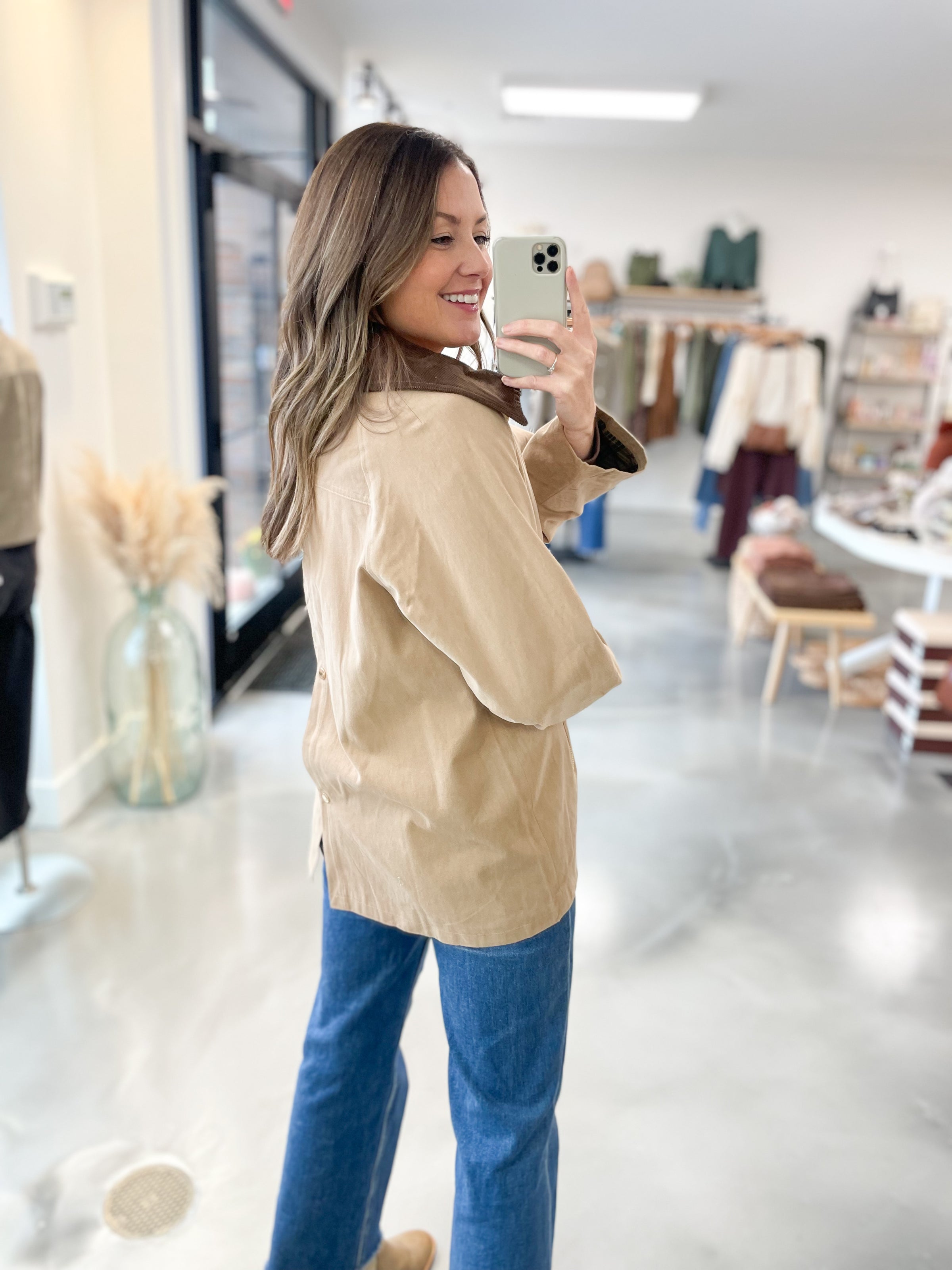 This tan chore-style jacket is the perfect mix of casual and classic. It features a dark brown corduroy collar, gold zipper and snap hardware, and a cozy plaid lining that peeks through when cuffed. The relaxed fit makes it easy to layer over your favorite tees and sweaters, while the soft, durable fabric gives it that timeless, lived-in feel. A fall layering staple that adds just the right amount of rugged charm to any outfit.