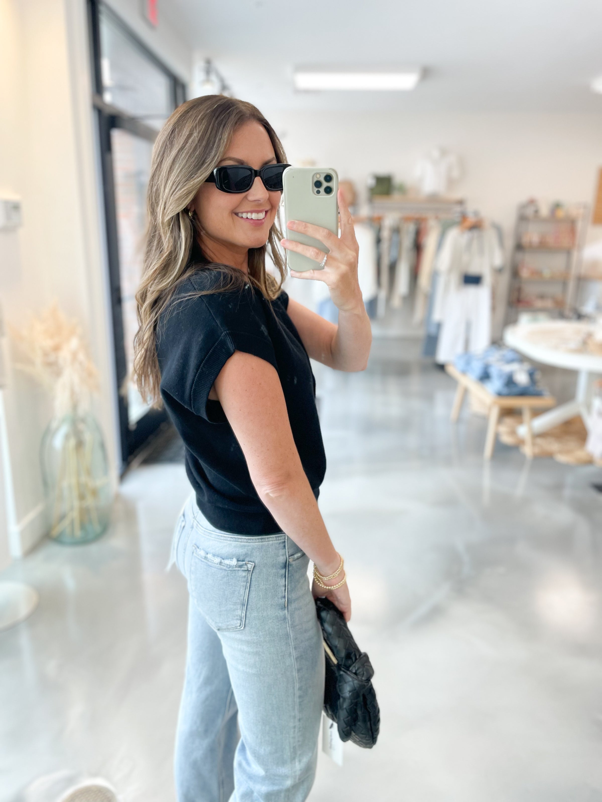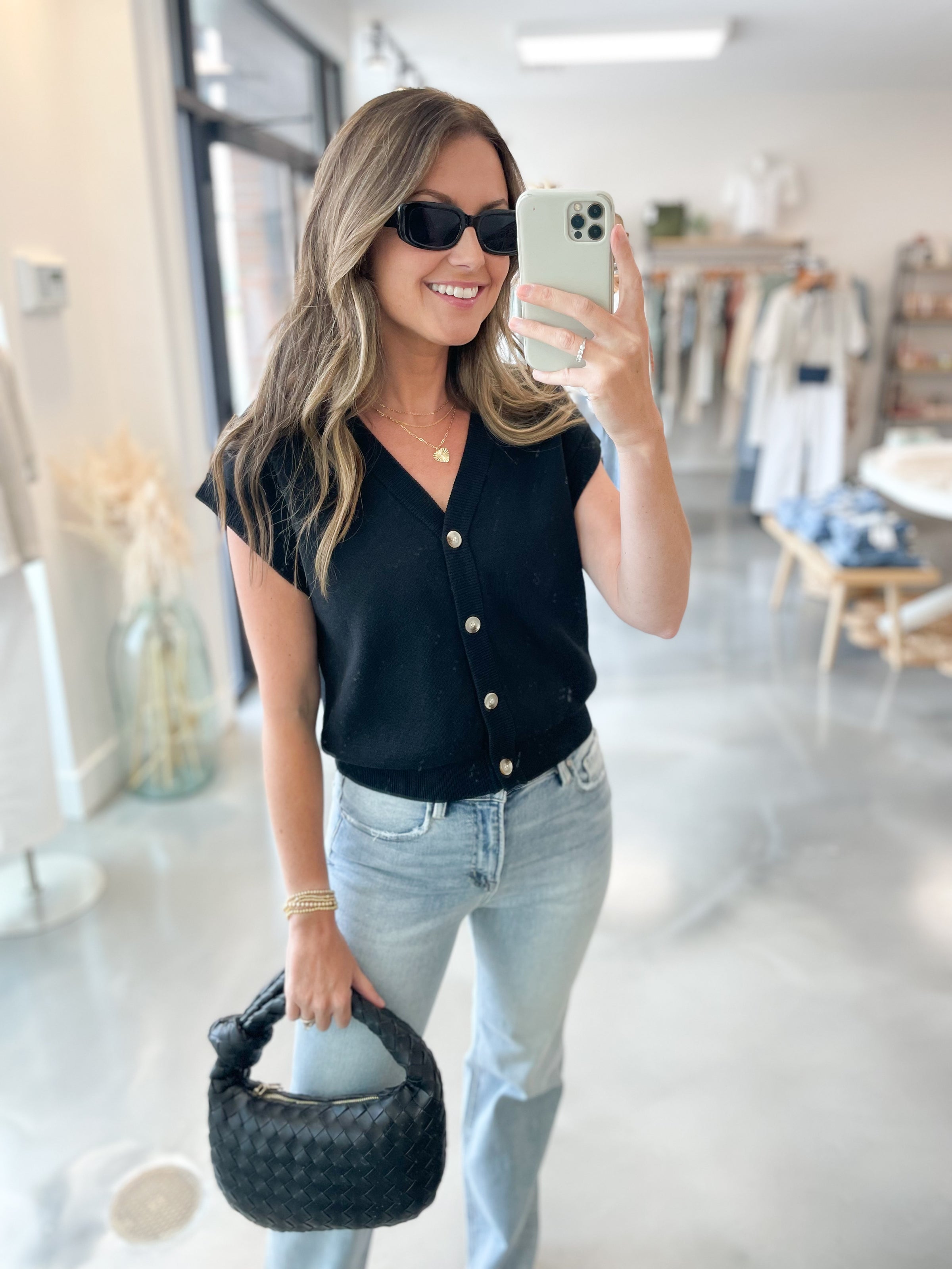 A timeless take on a closet staple, this black sweater vest brings polish and versatility to any look. Featuring a classic V-neckline, full button front, and clean ribbed detailing at the hems. Its soft knit and flattering relaxed, semi-boxy fit makes it perfect for layering or wearing on its own.