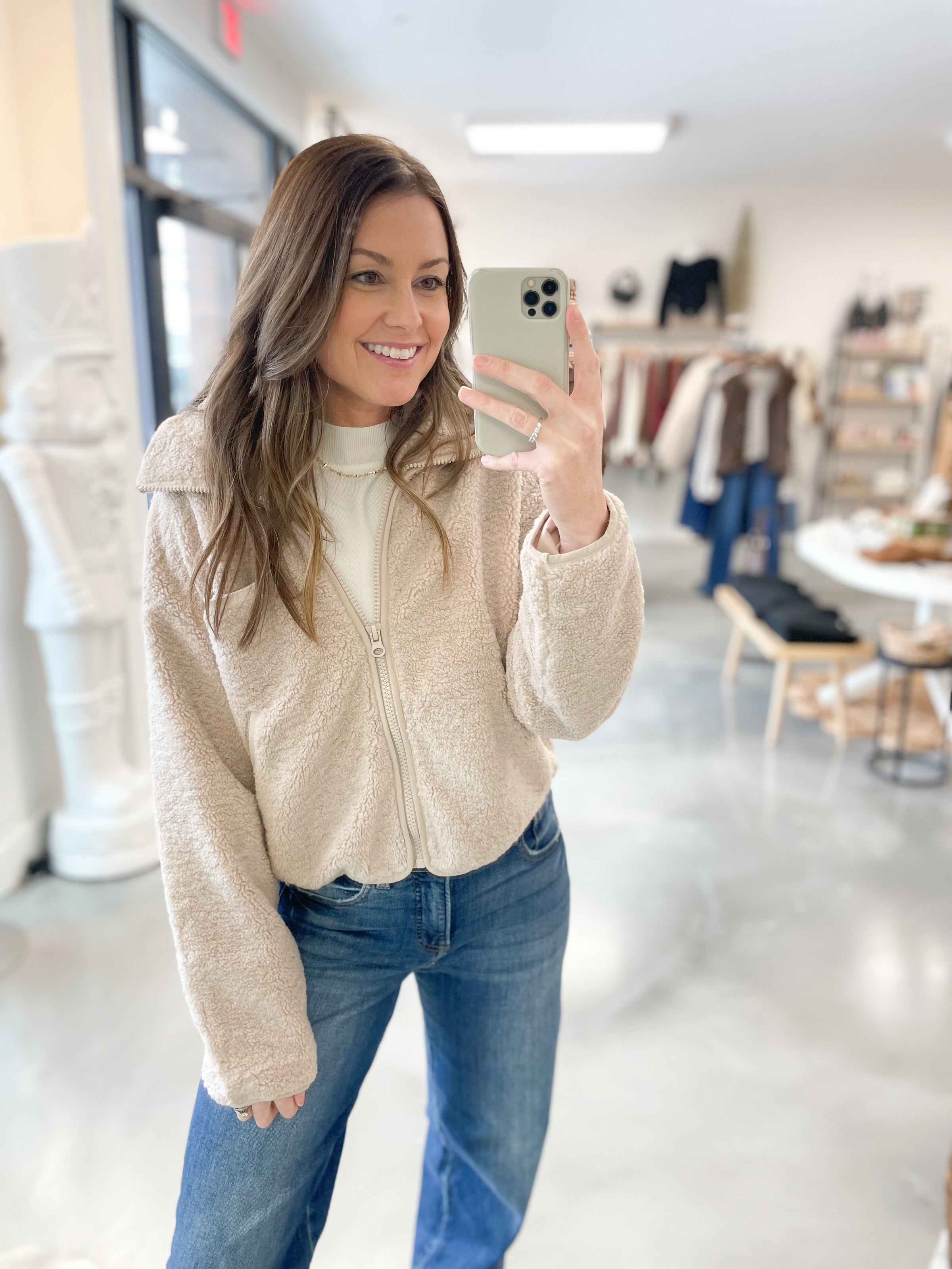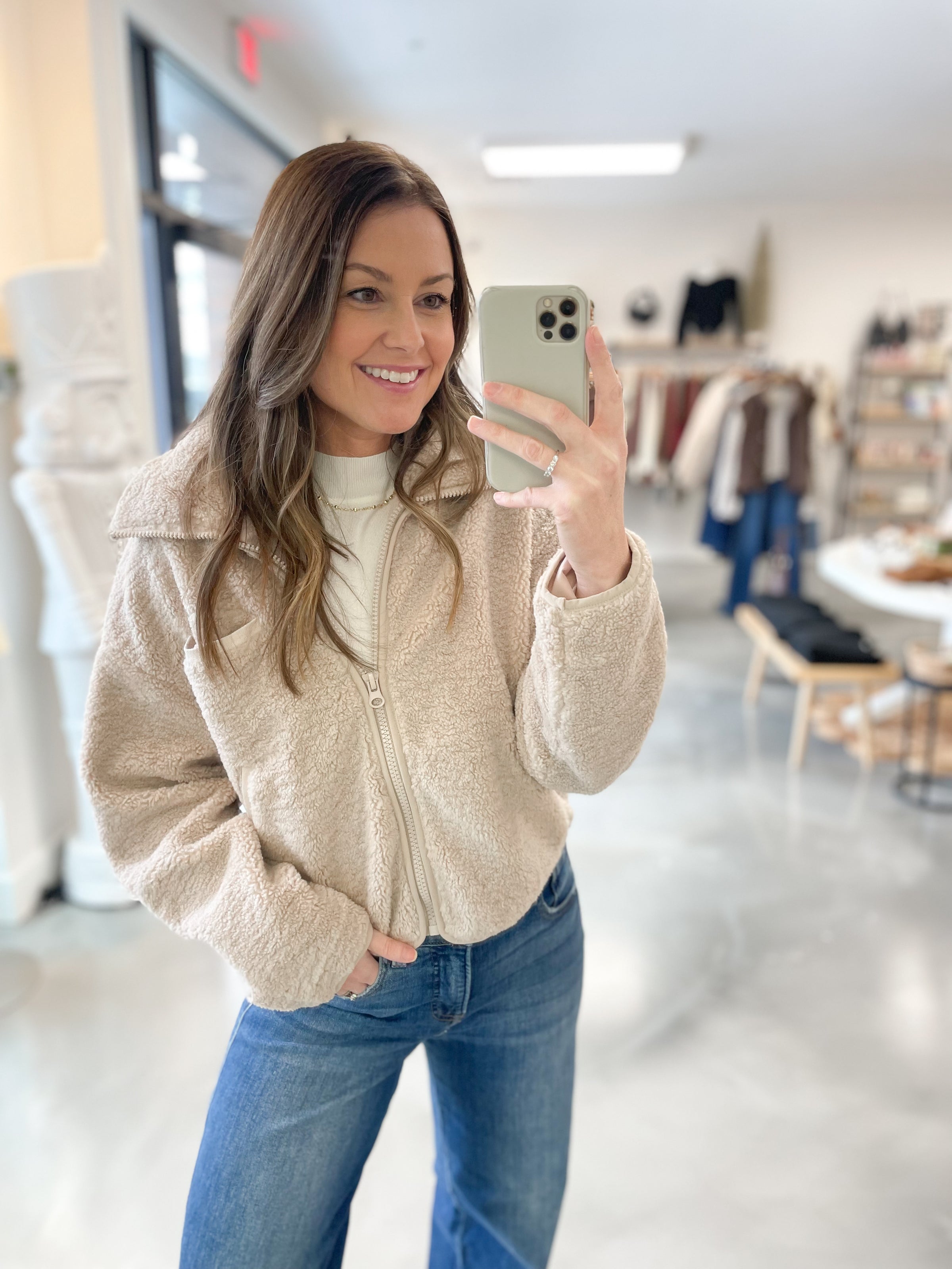 Soft, cozy, and irresistibly plush —this cream sherpa jacket checks all the boxes! Features a folded high collar, side pockets, and a chest pocket detail. This jacket is fully lined to keep you extra cozy this winter!