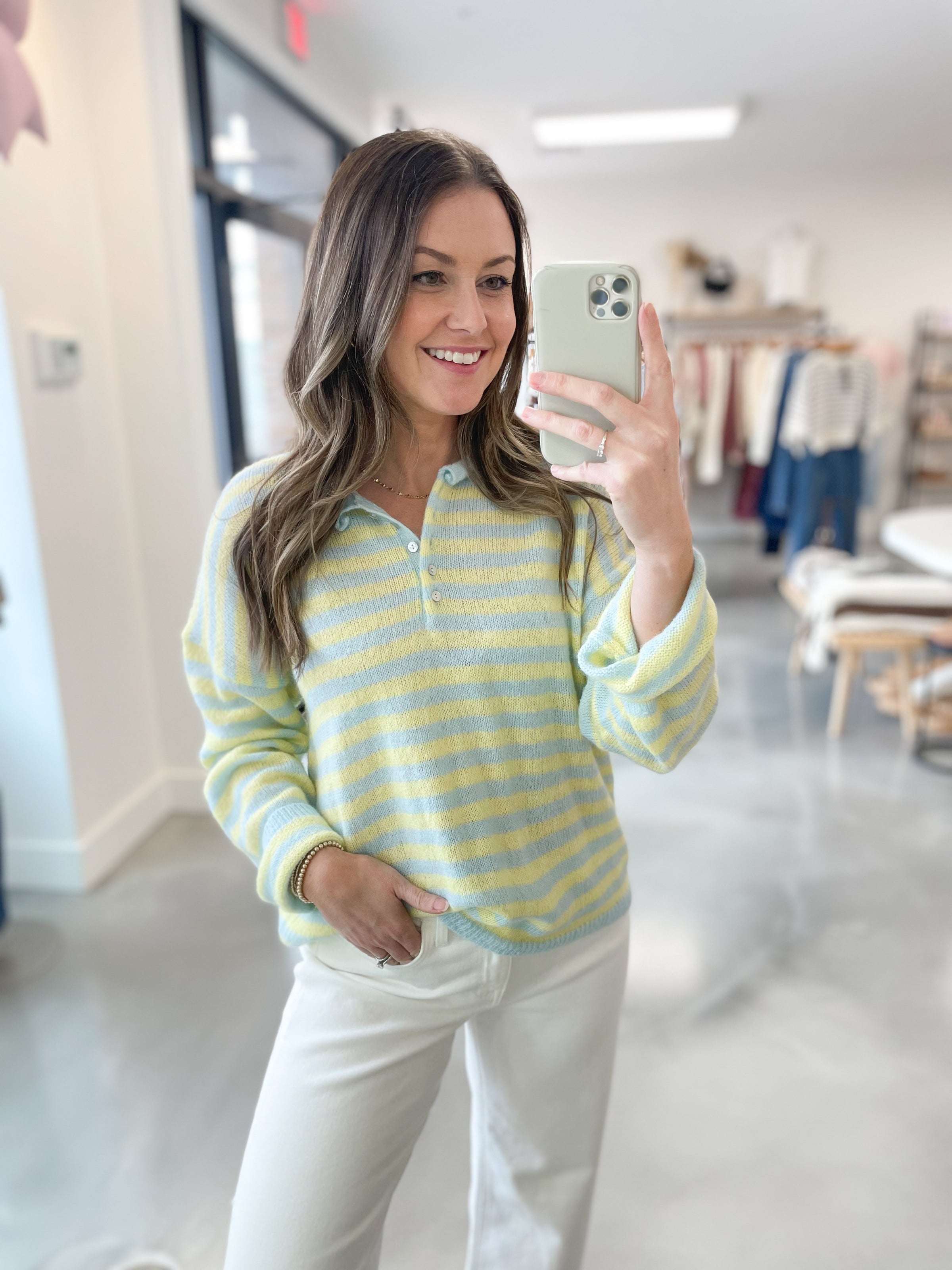 A fresh take on a classic, this lightweight sweater features soft light yellow and light blue stripes for the perfect pop of spring color. Designed with a relaxed fit and a henley-style button neckline, it’s equal parts cozy and effortless. The soft knit and easy silhouette make it perfect for layering or wearing on its own with your favorite denim for an easy, everyday look.