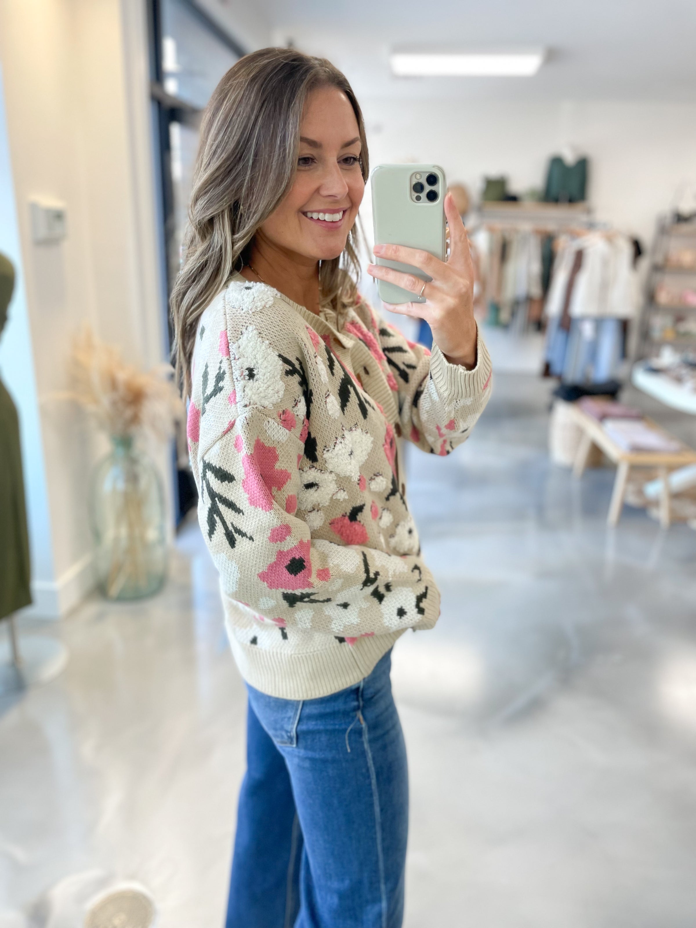 Cozy meets playful in this darling floral cardigan. Featuring a soft oatmeal knit scattered with bold blooms in shades of pink, white, and hunter green, it’s a cheerful layer that instantly brightens your look. The relaxed fit, button-front design, and ribbed trim keep it classic, while the statement print adds a fun pop of personality.
