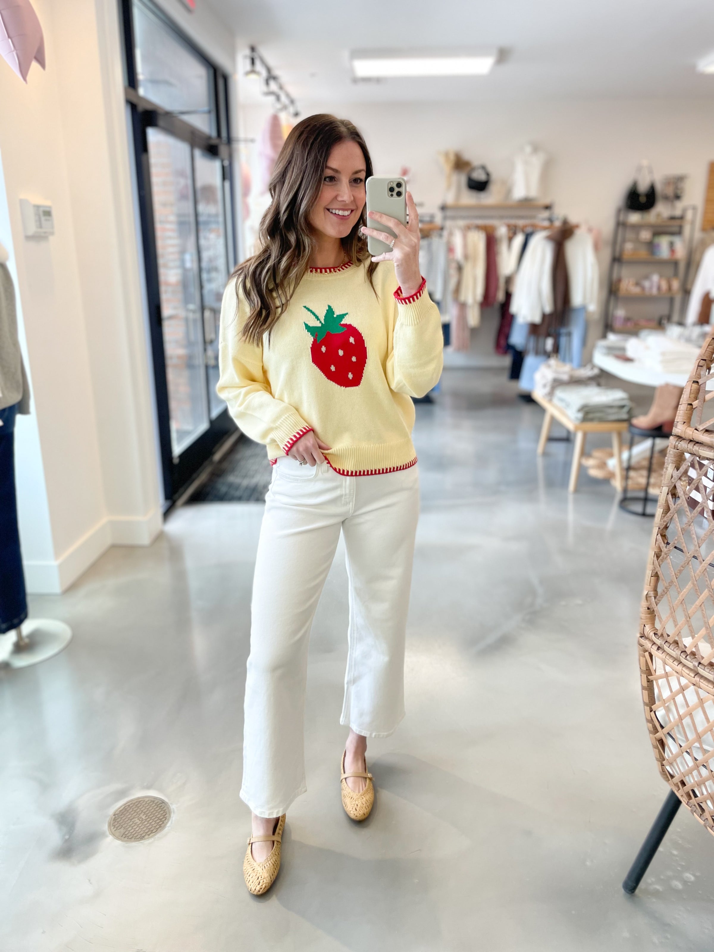 Sweet with a little vintage charm! This butter yellow sweater features the cutest red strawberry front and center, finished with red stitch detailing at the hem, neckline, and cuffs for that extra pop of contrast. Soft, cozy, and just the right amount of playful, it’s the kind of piece that makes any outfit feel instantly happier. Pair it with your favorite denim for an easy, feel-good look.