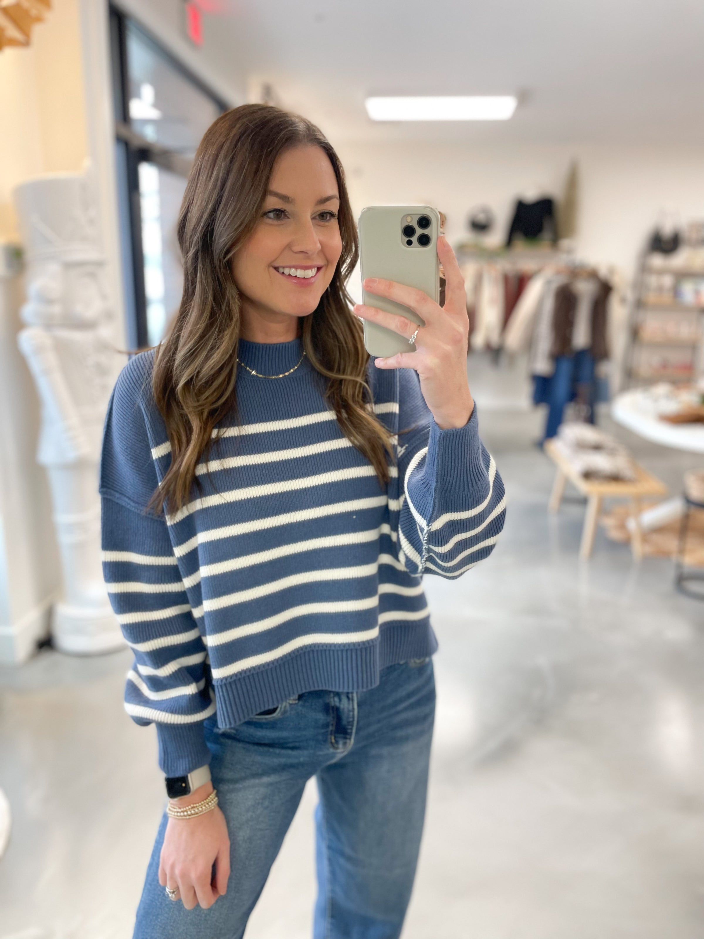 Effortless style meets cozy comfort in this dusty blue sweater with crisp white stripes. The slightly oversized fit gives it a relaxed, laid-back feel, while the classic stripe detail keeps it chic and timeless. Perfect for layering over denim or pairing with skirts, it’s an easy, go-to piece for cooler days that looks just as good on weekend coffee runs as it does at casual office days.
