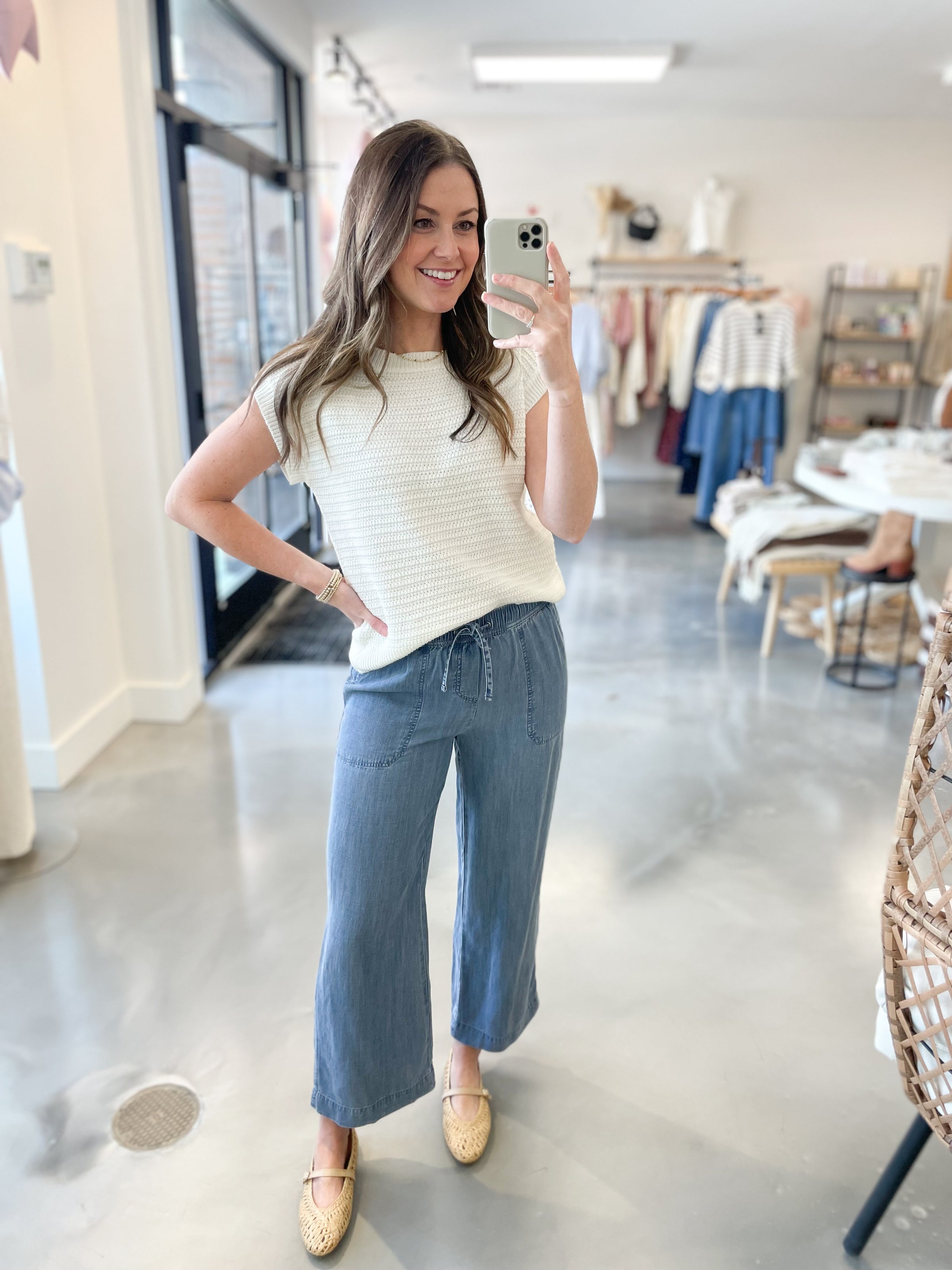 Effortlessly cool and endlessly versatile, these chambray wide leg pants are a warm-weather must-have. Designed with a relaxed, flowy fit and lightweight chambray fabric, they offer all-day comfort with an easy, laid-back feel. The wide leg silhouette drapes beautifully for a flattering look, perfect for pairing with our Mollie sweater or keeping it ultra casual with a simple tee and sneakers. A closet staple you’ll reach for again and again.