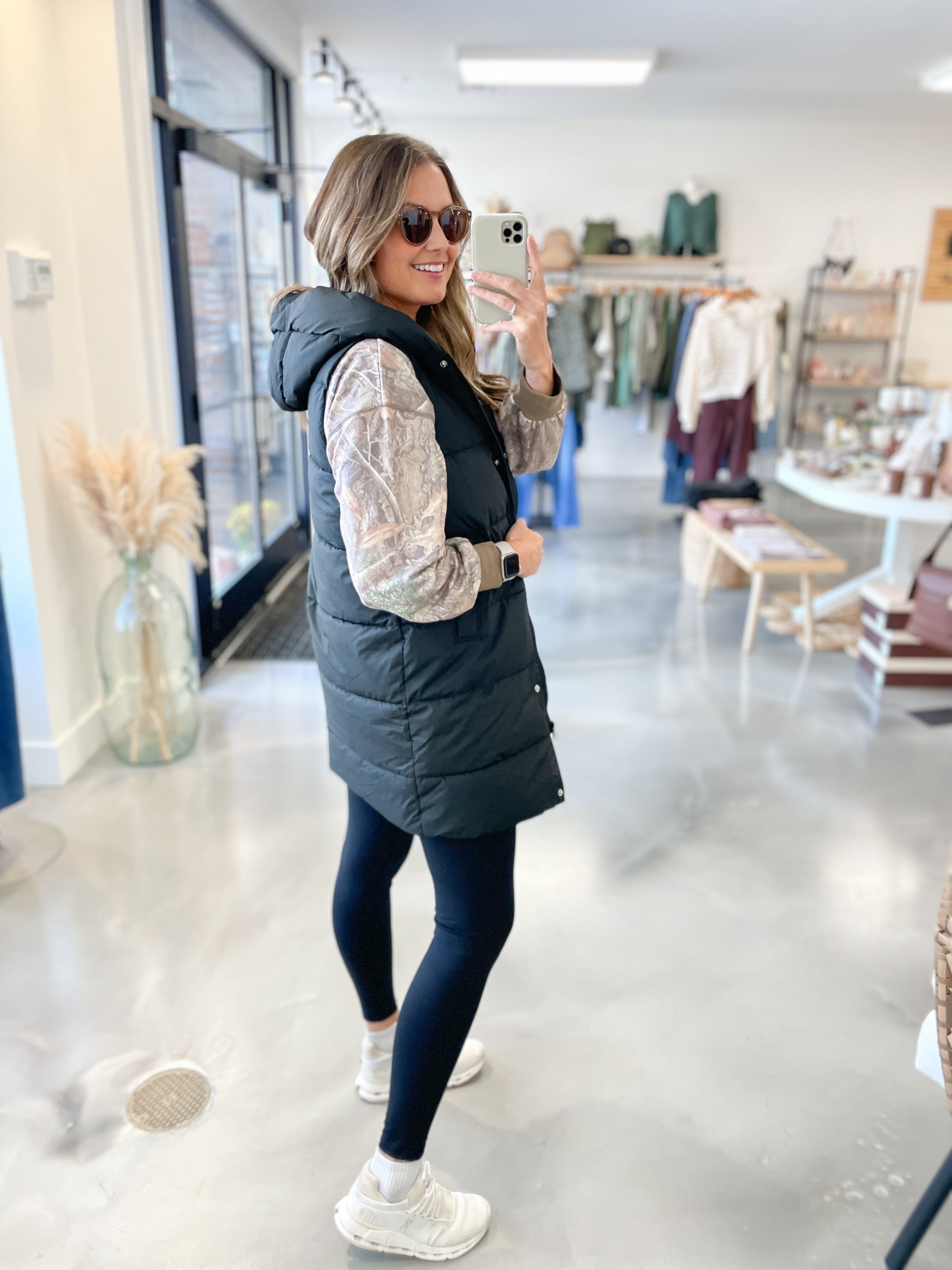 Stay warm and stylish in this long black puffer vest — the ultimate cold-weather layer. Designed with a sleek puff finish, this vest features a zip-front closure with snap buttons for extra coziness, a roomy hood for added warmth, and side pockets to keep your hands toasty. The longer length offers extra coverage, making it perfect for layering over sweaters and flannels on chilly fall days.