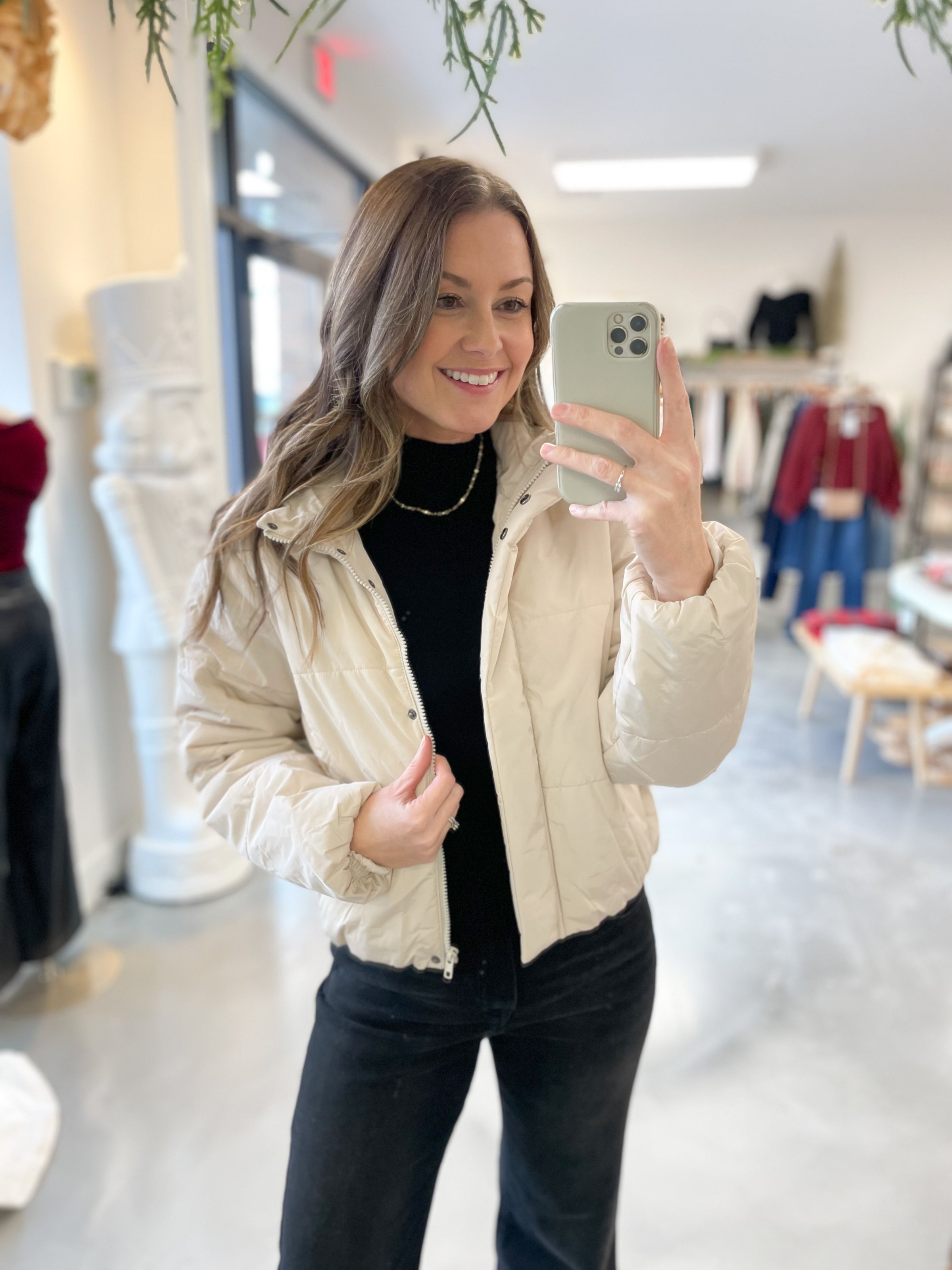 Stay warm without sacrificing style in this ultra-chic cream cropped puffer. Designed with a modern, boxy silhouette, this jacket brings the perfect blend of cozy and cool. The soft, quilted finish adds just the right amount of puff, while the cropped length pairs effortlessly with high-waist denim, joggers, and winter minis. Finished with a high neck, smooth zip front, and roomy side pockets, it’s the statement layer you’ll reach for all season long.