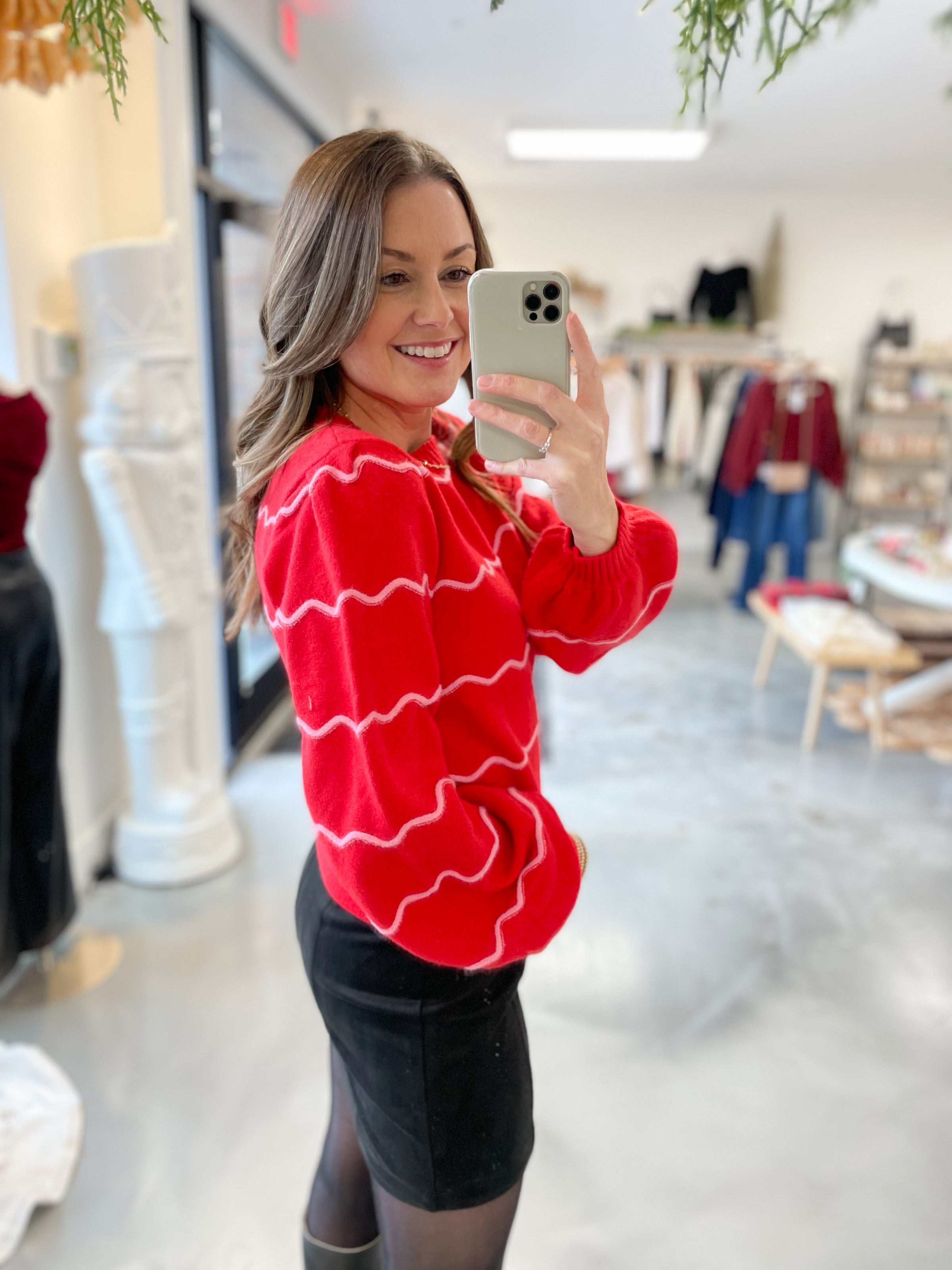 Brighten your winter wardrobe with this cheerful red knit, finished with playful wavy stripe detailing. Featuring a classic crew neckline and softly voluminous balloon sleeves, this sweater brings the perfect blend of cozy and fun. The relaxed-yet-feminine fit makes it easy to style with skirts, denim, or holiday layers. A festive pop of color you’ll reach for all season long.