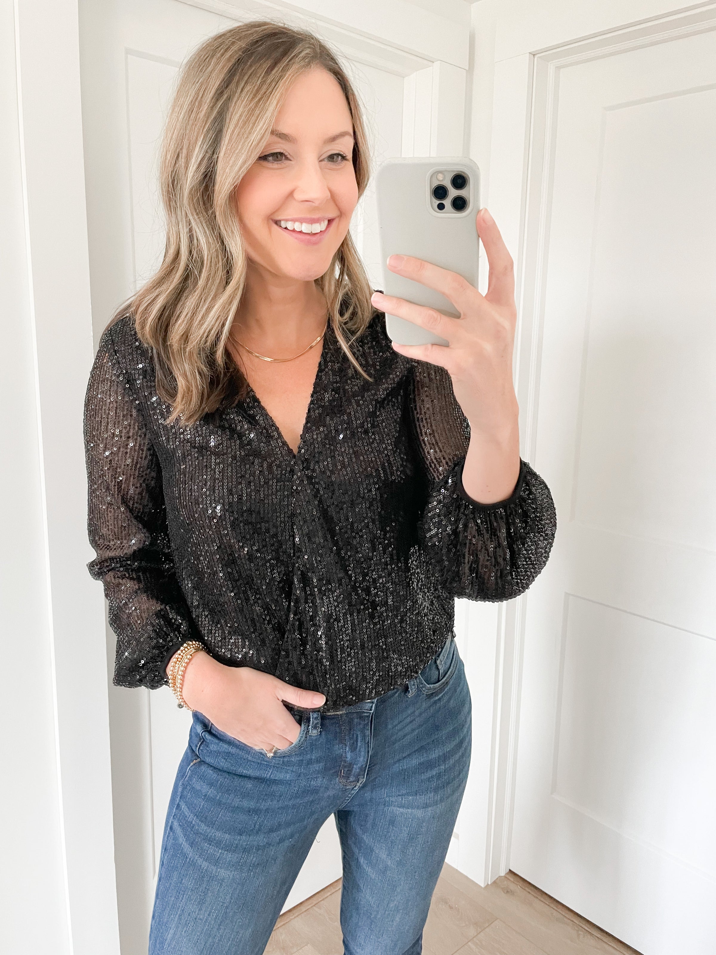 Sequin bodysuit with a fully lined body, semi-sheer sleeves and a concealed snap closure at the chest. Full bottom briefs with a snap closure between the legs.