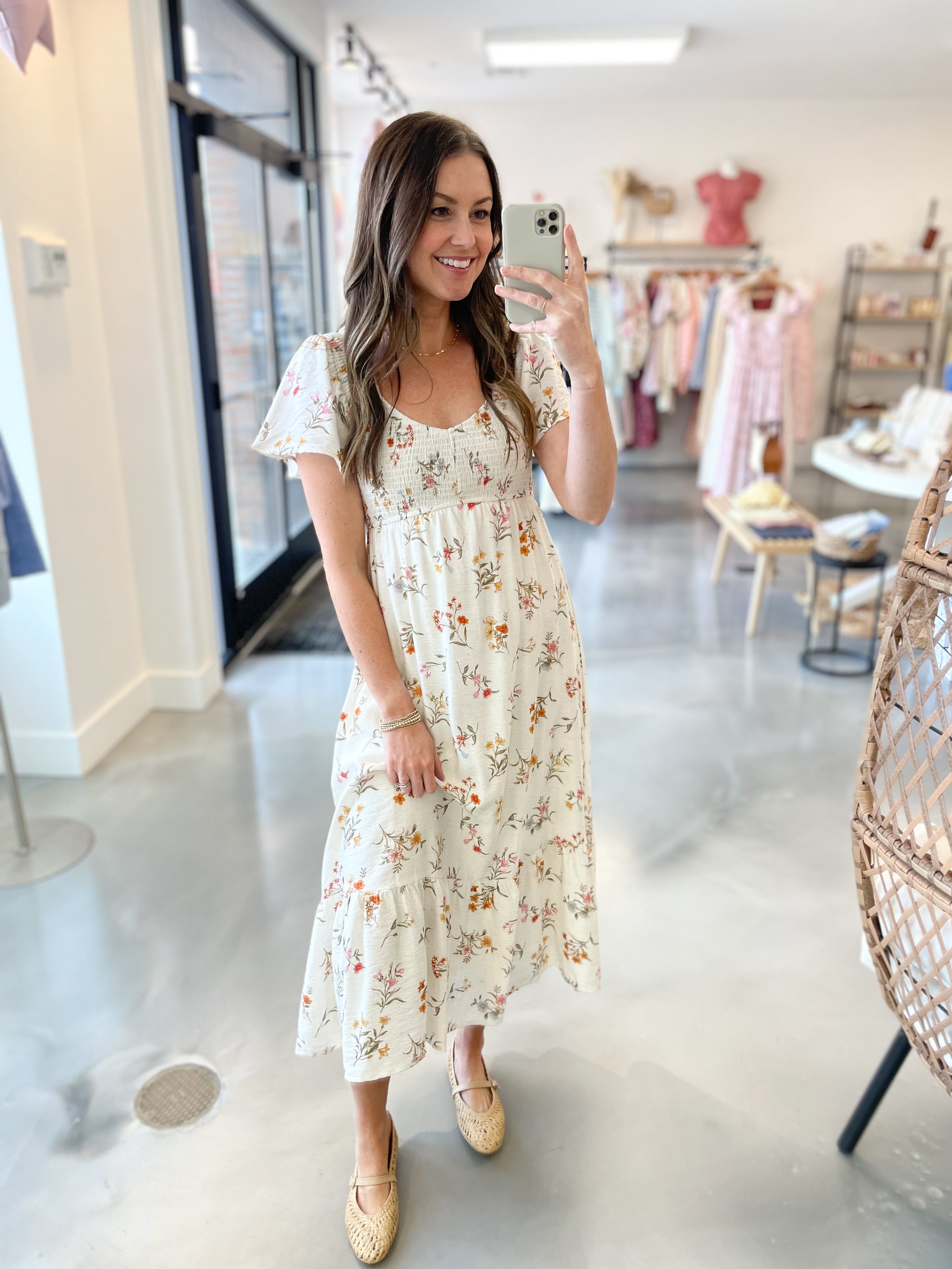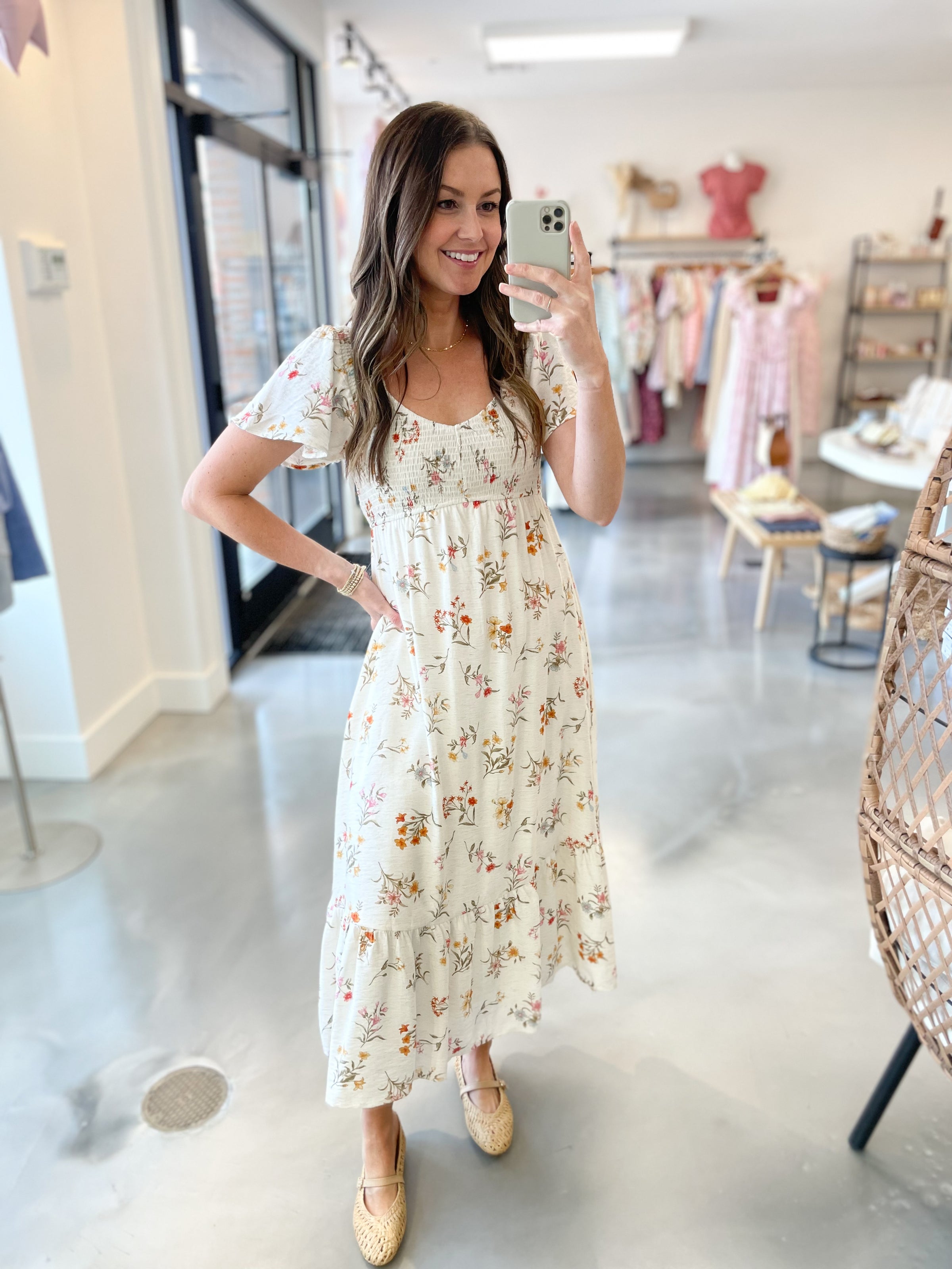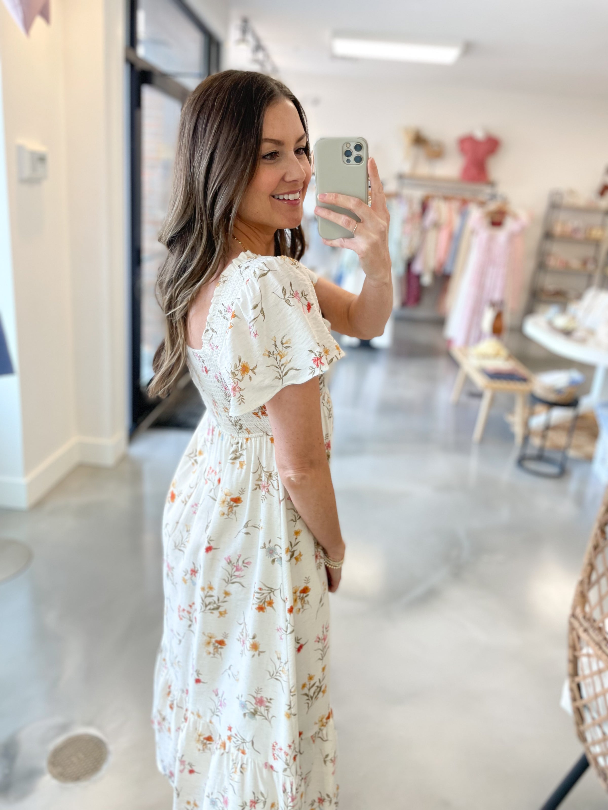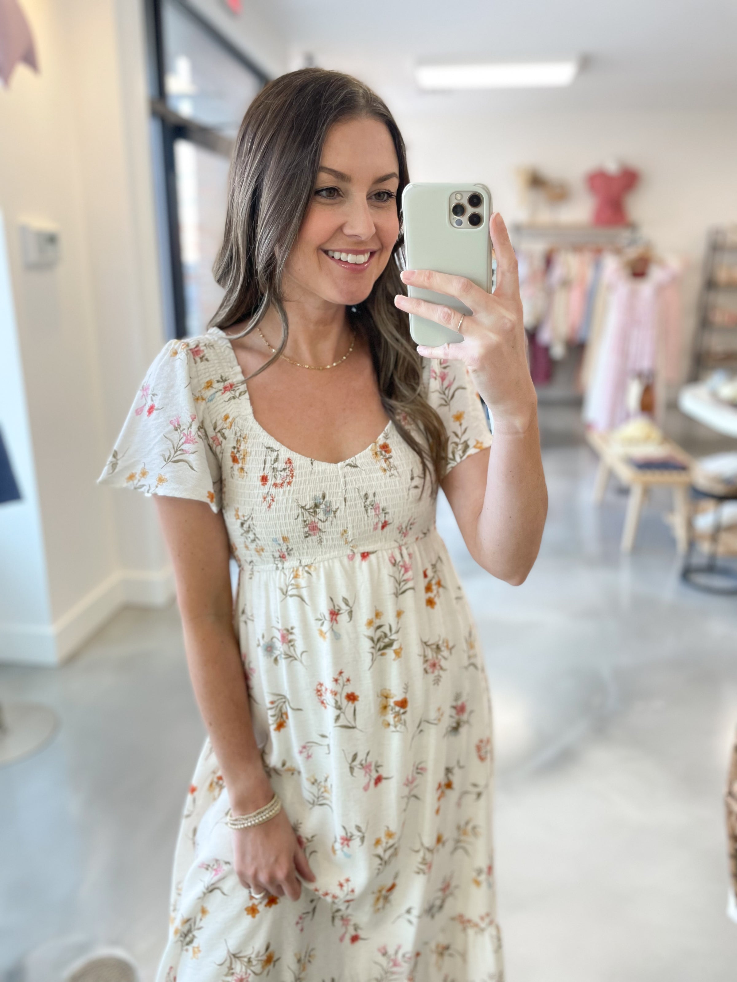 Fresh, feminine, and effortlessly elegant — this white maxi dress is made for your prettiest moments. Designed with a smocked bodice for a flattering, comfortable fit, it features soft flutter sleeves and a delicate allover floral print that adds just the right touch of charm. The flowy maxi silhouette creates beautiful movement, making it perfect for everything from showers to summer evenings.