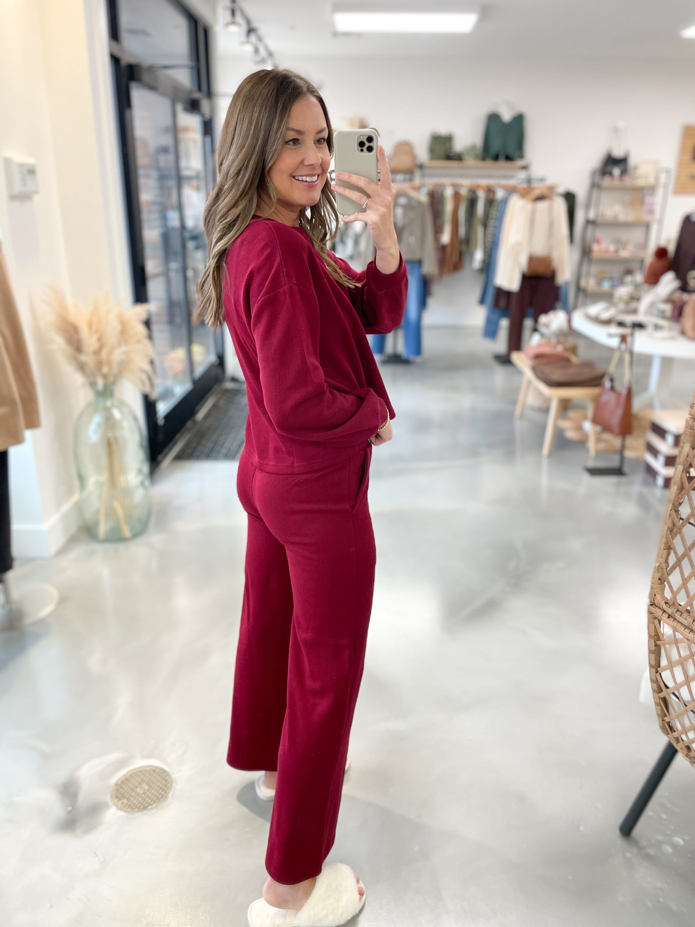 Meet your new off-duty favorite — this wine lounge set is the perfect blend of cozy and chic. The wide-leg pants feature a relaxed fit with functional pockets for ultimate comfort and ease, while the slightly cropped top keeps the look modern and flattering. Soft, stretchy fabric makes it ideal for lounging at home or running errands in style. Effortless, elevated, and so comfortable — you’ll want to live in this set.