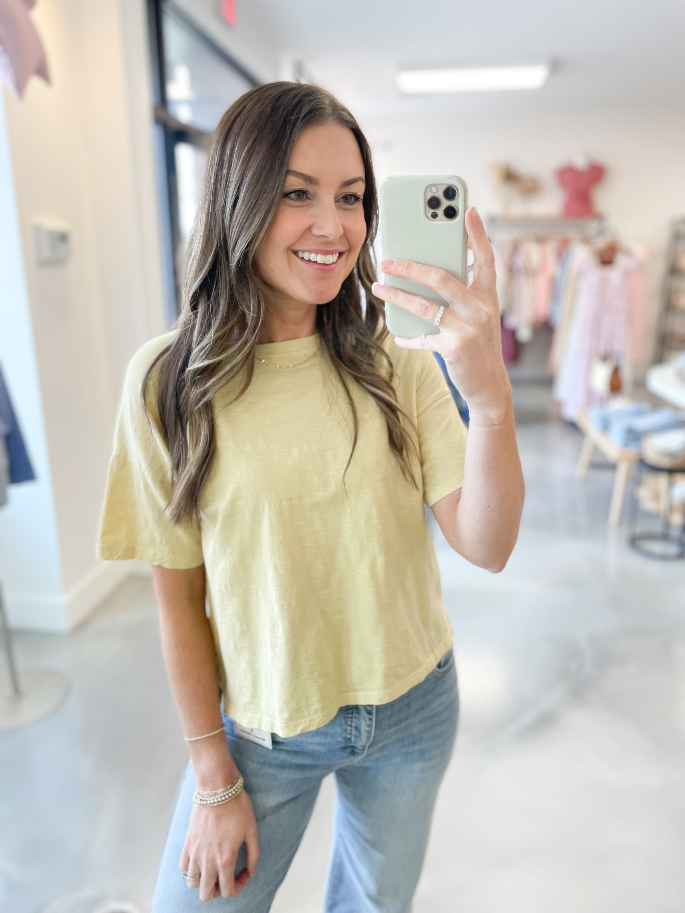 Your new everyday favorite — this soft, 100% cotton tee has that perfectly lived-in, vintage feel from the very first wear. Designed with a relaxed, boxy fit, side split hem, and a slightly cropped length, it hits just right with high-waisted denim or shorts. The vintage wash gives it that effortlessly cool, worn-in look you’ll keep reaching for.